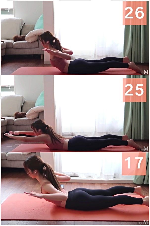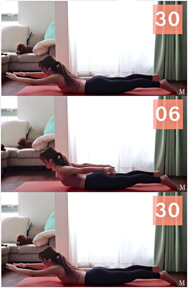 STEP6.接著向前趴下,雙手向前伸再手臂向後,向後時要有肩胛骨夾緊的感覺,重複動作做30秒!