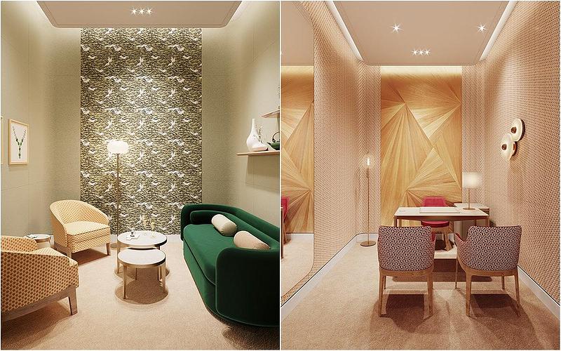 設置於入口處附近,使貴賓一眼就能發現全台首座的擺件及香水陳列牆面,牆面上將以Les Nécessaires à Parfum Cartier卡地亞香水盒為主,華美且高雅,既是口袋或手提包中的實用配件,亦是賞心悅目的裝飾臻品。這四款香水盒的造型流光溢彩,飾有金色、銀色、深藍色和深綠色真漆細條紋,引人入勝。