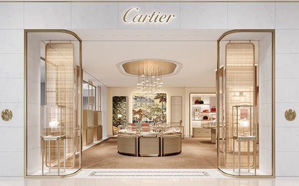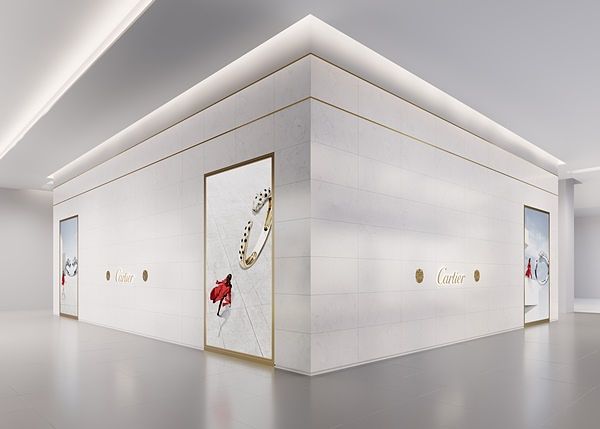 全新空間概念主軸圍繞著一個充滿法式情調的語詞:「香檳概念」,為卡地亞形塑出摩登、清新、女性化、年輕與舒適的購物氛圍。外牆採以義大利進口頂級白色大理石裝飾,內部裝潢延續卡地亞法式優雅風情, 使空間感更加寬敞、明亮,入口處可見一盞高4米的當代水晶燈飾,展現恢弘氣勢。