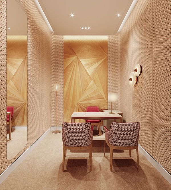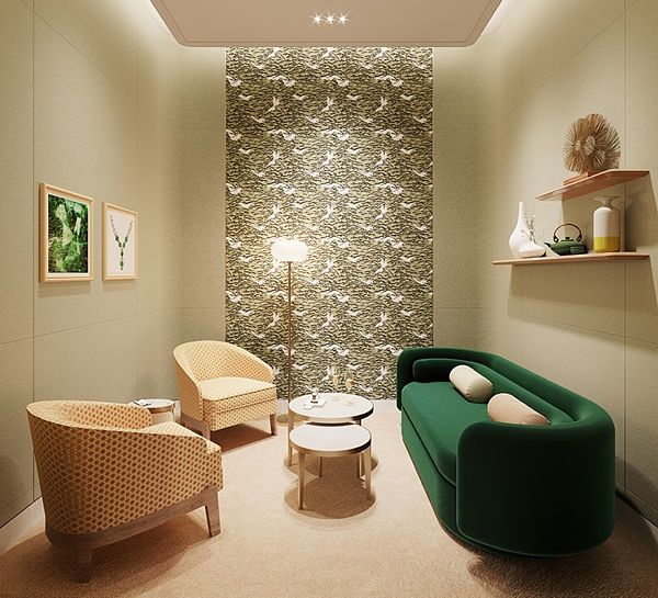整體以獨特的絲綢與錦鍛織物、大膽地使用美麗印花與鮮活色彩,營造出優雅奢華質感,特別能與極簡洗鍊的的空間設計搭配。同時擁有貼心訂製的行動充電裝置小圓桌供貴賓使用。