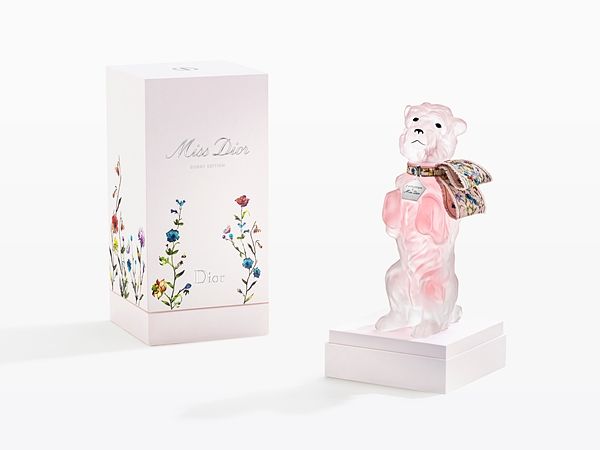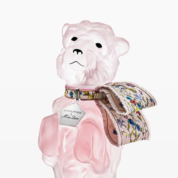 打開美麗外盒,一場華麗驚喜就此展開。狗兒胸口掛著一面精心雕刻的名牌,寫著「我屬於Miss Dior」,熟知迪奧歷史的人就知道這象徵 BOBBY 對主人 Miss Dior 女士無條件的愛。每一瓶《MissDior 香氛- BOBBY 限量復刻版》都是精緻的玻璃精品,歷經超過 15 小時的手工燒製,最後再繫上由迪奧高級訂製工坊製作的 Miss Dior 單耳蝴蝶結,讓繽紛絢爛的繁花意象,於短短幾公分的蝴蝶結上栩栩綻放。製作過程,訂製師傅全程以嚴謹手工精準對花。先在緞帶上印出圖樣,再以手工縫上各種彩色,構築繽紛明亮的花束風景,與紮染的粉彩底色恰成對比,最後細心收邊,梳理出細膩雅緻的毛鬚,才得以完成這充滿細節、每個都是獨一無二的單耳蝴蝶結。