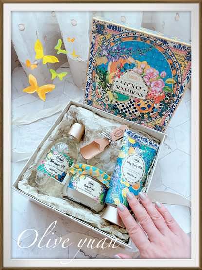 另外還有「南歐市集三部曲限量禮盒」,有繽紛野梨、香蘋薰衣草、西西里柑橘三種香味,裝在編織果籃中,籃子還可以當束口袋使用,公關們大推!看到那市集的照片,就好想穿我的花洋裝出門走走!