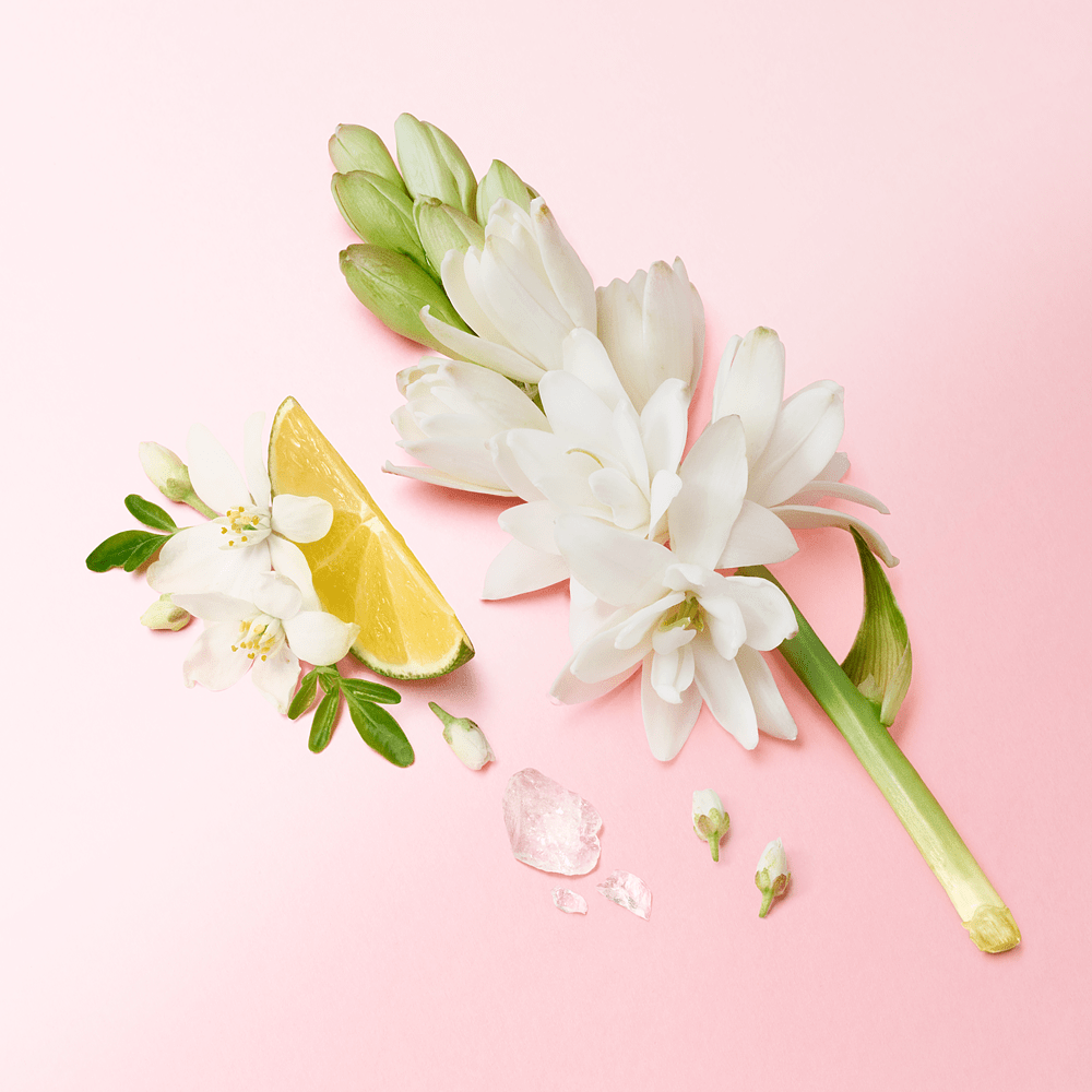 耀眼陽光下的白花純淨通透,花開在最美時分釋放出扣人心弦的明亮花香,在橙花、晚香玉、茉莉的交織下更能顯出女人內心真我純粹氛圍,透過義大利佛手柑、雪松、白麝香的疊加,在點亮內心後,重新探索自我追尋更幸福的旋律。