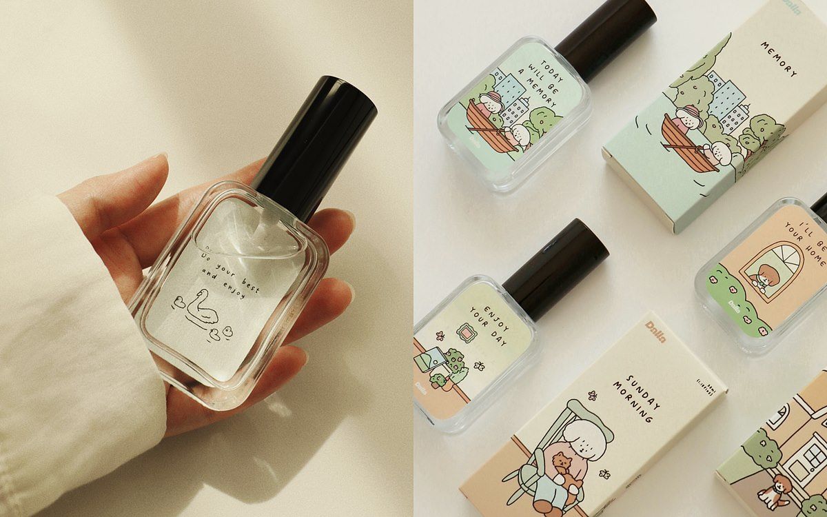 本期最新款的香氛創作,特別邀請到在泰國曼谷廣受年輕人喜愛的Line主題插畫家「Chonni」,常以暖心的設計和動物主題療癒人心,與本期品牌想要強調的日常感香味主軸不謀而合。Dalla 最新推出的香氛主題共有三款,以日常生活的場景與粉嫩的大地淡色系為主,例如:莊園、湖泊,或是舒適的家裡,配上療癒的狗狗人物與貓咪,理想的生活畫面將會隨著氣味躍入腦中。除了在包裝上有連貫式主題設計,並在香水的瓶身上使用正向語句的雙面貼紙替代了品名, 貼紙前後字句正向溫暖,是極少數貼紙上沒有品名的商品,讓使用者不管是開心或是低潮的時候,也能被療癒的插畫和標語所鼓舞,用心渡過平凡又獨特的每一天。