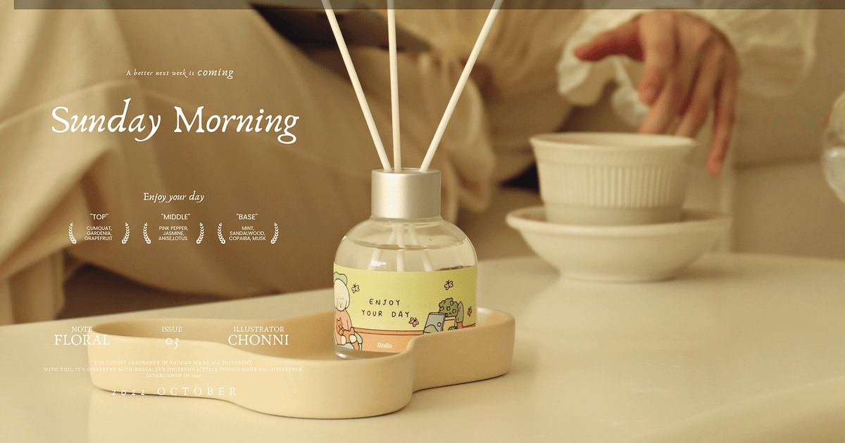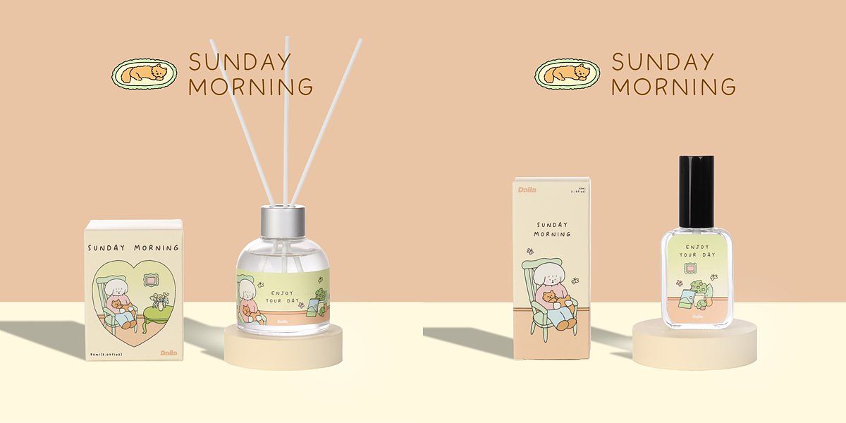 要帶來愉悅心情的質感花香調,「週日早晨 Sunday Morning」的純淨淡雅香氣最適合出遊或是聚會時使用。香水的重要性與衣服打扮一樣重要,Dalla 的淡香水不泛黃、不染色的特質也可放心用於織品上,純淨的淡香彷彿是自然散發的體香 ,一點使用在身上,一點使用在織品上,能增加持香時間,讓味道更有立體層次。整體的視覺設計以美好的週末來發想,早晨泡杯咖啡、嚕嚕貓, 享受一個人的放鬆時光,是再美好不過的週日日常。