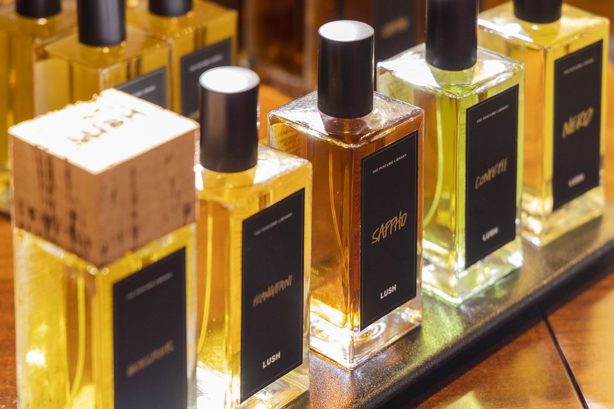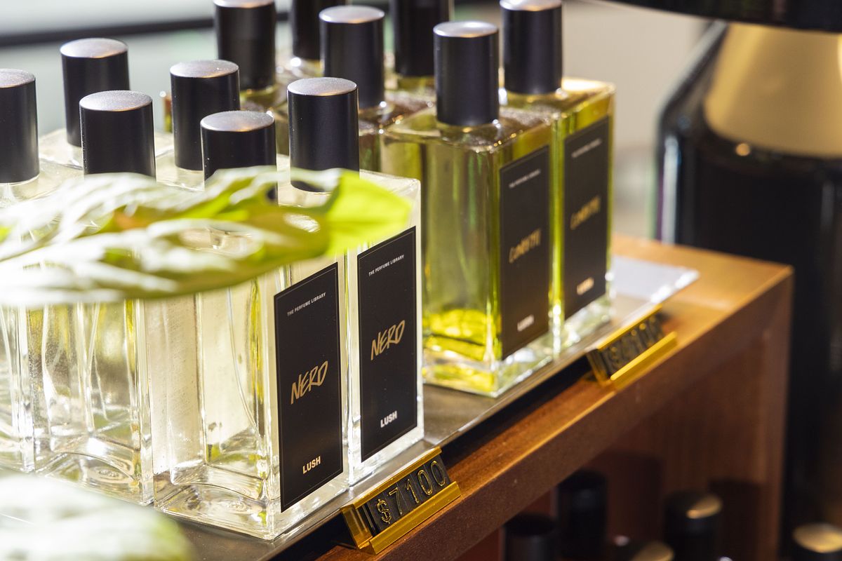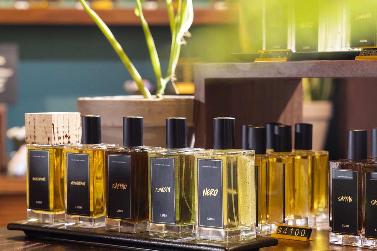 Lush 忠孝店是大中華區首家,也是亞洲第 3 家、全球第 9 家香水圖書館專門店。黑色標籤的香水圖書館(Perfume Library)系列有別於白色標籤的核心系列。香水圖書館系列涵蓋 29 種香氛,並僅以 100 ml 容量販售,其中 5 款僅有香水圖書館店鋪限定的文藝復興靈感香氛,包含 Lush 首款慈善香氛 Grassroots – 草根福祉慈善香水 ,以及 Confetti、Frangipani、Nero、Sappho。29 種香氛的發明歷史,最早可以追溯至 Lush 品牌在 1995 年正式成立之前的日子 – Lush 品牌的前身 Cometics to Go 郵購目錄時期及早期香水系列 Be Never Too Busy To Be Beautiful,可見香水長久以來,早已是 Lush 品牌靈魂的核心。