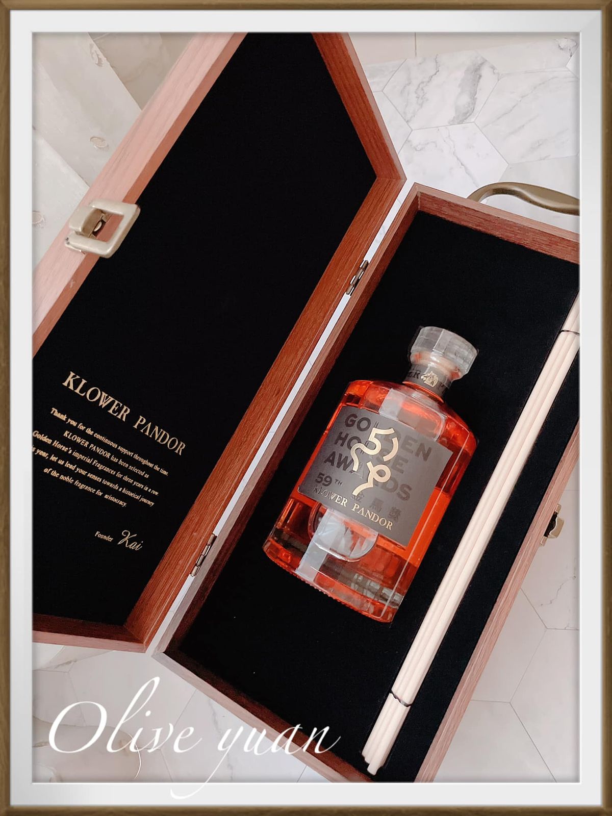 這款迎賓禮真的夠奢華,整個是皮革木提式外盒,以仿藏酒盒為設計理念,搭配皮革燙金壓紋,釦環的部分也相當精美,打開後看到的擴香瓶為手工訂製玻璃,25道鑽石光澤切割工藝根本威士忌呀!再加上金馬59th燙金瓶標,好有紀念價值,而香氣選用的是KP經典香氛、男女都會喜歡的─「暮光琥珀」。