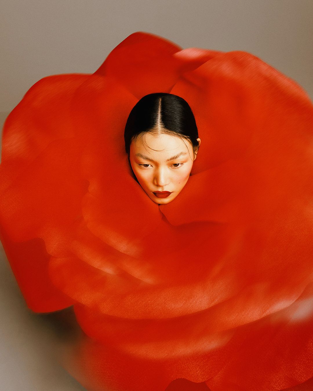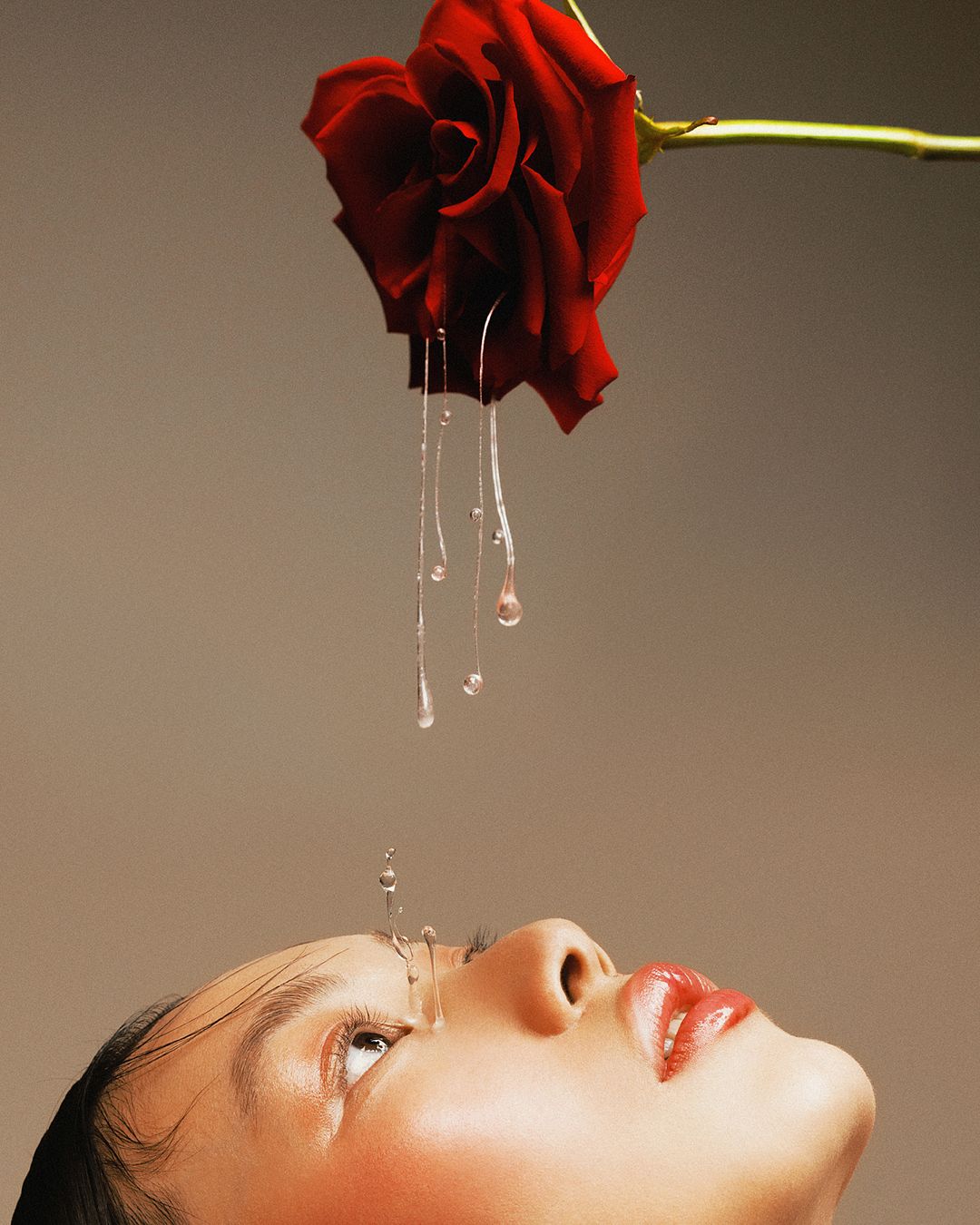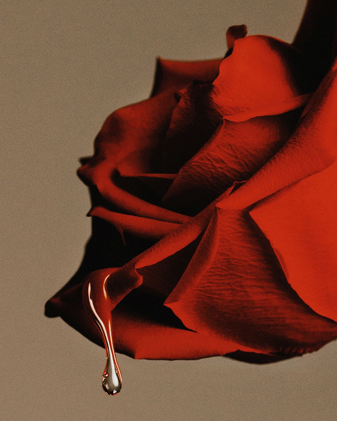 透過歌曲的啟發鍾靈創作了無人之境系列作品,其中每個故事都有色彩主軸,首篇是炙烈純粹的「紅」— 私密而熱情,玫瑰飛舞迴旋。隨著構圖磅礡展開,淚水以超現實的姿態逆流而上。