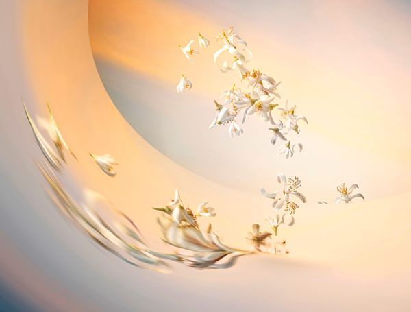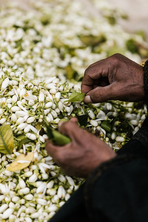 在摩洛哥湛藍無雲的天空下,數百棵橙樹映入眼簾,形成蔚藍與蓊鬱的畫面,並點綴著白色小點。在這裡,數千朵雪白色的小花由枝條與葉子襯托,綻放著新鮮。黎明時刻,空氣中充滿寧靜,尚未被灼熱的太陽劃破,橙花的香氣是如此地明顯卻柔和,無限的優雅,散發著清新明亮、活力充沛的花香調,展現出直衝天際翱翔的調性。