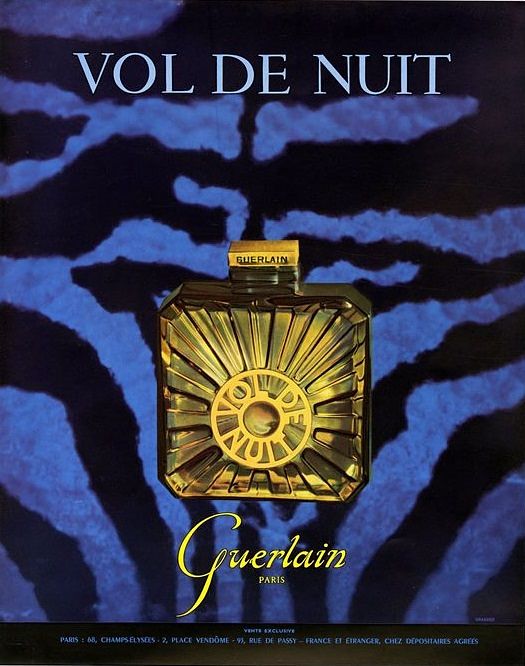 在如此背景時代之下,雅各•嬌蘭透過「Shalimar一千零一夜」香氛詮釋印度之夢、透過「Mitsouko蝴蝶夫人淡香水」詮釋日本之美、透過「Vol de Nuit午夜飛行」香氛詮釋飛航冒險精神,與安東尼.聖.修伯里於1931年出版的小說「夜間飛行」同名,以向作者致敬。曠世巨作「夜間飛行」出版後2年,成為了香氛、畫面、物體的聯想之源。香氛的成分組成大膽,清楚描繪出佈滿雲朵的天空,而香氛瓶的設計則是以飛機螺旋槳作為靈感。