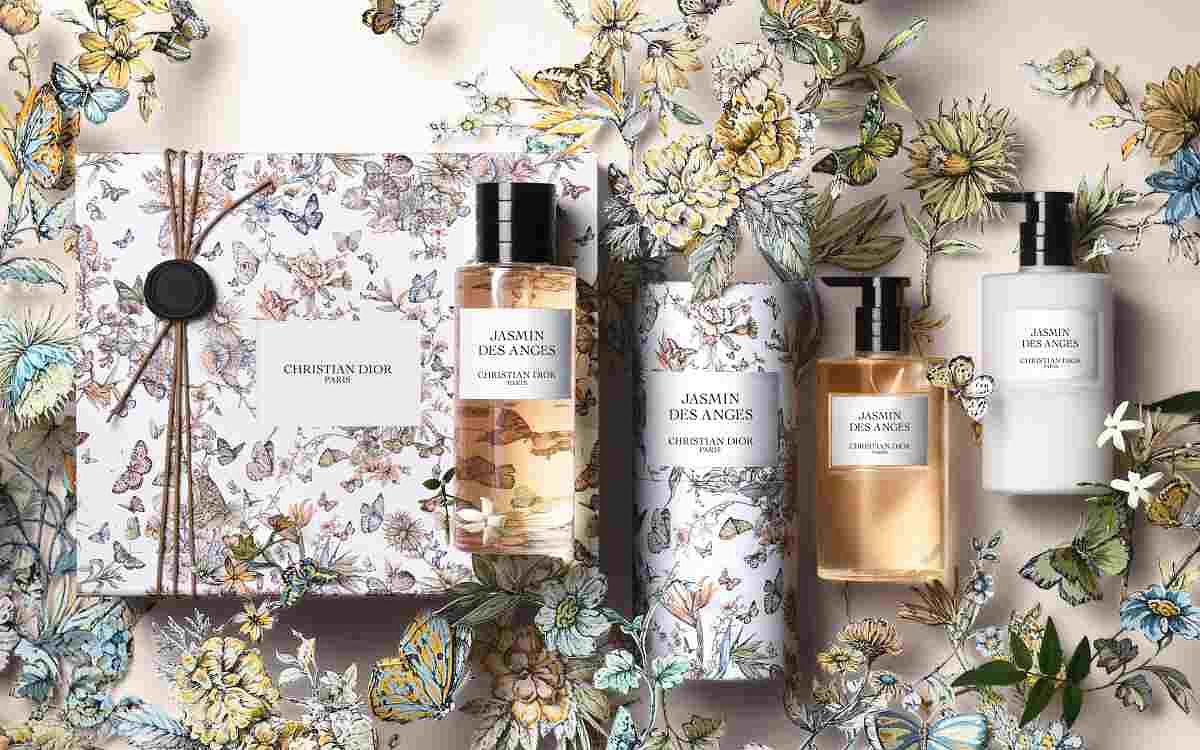 《晚夏茉莉香氛》是獻給夏末初秋的芬芳歌詠。迪奧先生最喜歡在南法海濱小鎮「尼斯」悠閒漫步,空氣瀰漫的香甜茉莉氣息,宛如粉嫩白花蕾絲般輕盈、舒適,散發著浪漫的法式風情。調香師將馥郁的茉莉花香揉合令人垂涎欲滴的甜杏、黑醋栗氣息,使香氛充滿飽滿香甜的水果氣息,散發浪漫、蜜糖、甜美氛圍。花園蝶舞限量版外盒,花卉宛如披上初秋的金黃餘暉,呈現出粉橘色調,吸引著蝴蝶環繞飛舞,引領你踏入格拉斯茉莉花田,來場難忘的南法之旅。
