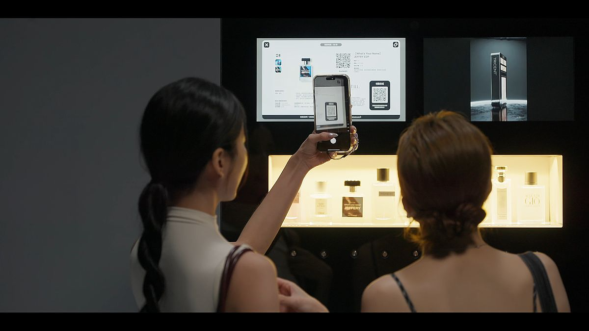TRICENT 香氛互動體驗機台採用觸控式螢幕操作,使用者可依照個人喜好瀏覽香調資訊、選擇想體驗的香氣,並將香氣精準噴灑於手腕或指定部位。整體流程快速、潔淨、不混味,沒有銷售壓力,特別適合不愛靠櫃的 I 人族群。若對香氣有興趣,還能透過 QR Code 延伸查看產品資訊或線上購買,讓選香回歸直覺與感受。