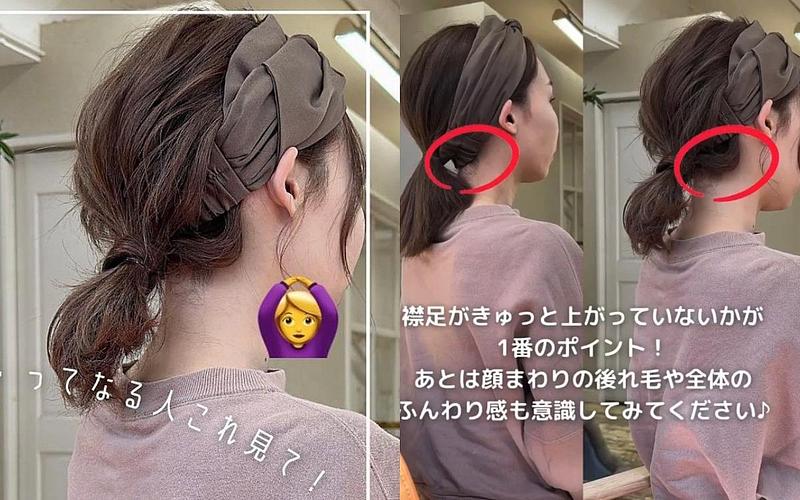 Step1.先套上髮帶並下拉垂放在頸部預備