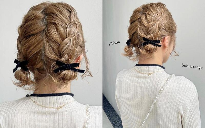如果你是中短髮的人可以這樣綁,先將表面髮束用電捲棒帶出些微捲度,再將頭髮分為左右兩半部,進行編辮的步驟,編到最後的髮束收尾可以做個反摺,然後再用電捲棒將殘留下來的髮絲做個捲度,最後用兩個蝴蝶結裝飾上去,這樣看起來時髦又可愛!