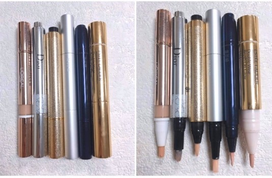 RMK跟YSL都是屬於比較水透感也很濕潤、加上裏頭有微珠光和些許亮粉,畫在手上就可以很明顯觀察到,拿來打亮感覺會立刻變成混血兒五官!LOREAL的質地稍偏乾、且較為濃稠,顏色較深,應該是屬於比較遮瑕的色彩(這款有三色可選擇)但其實光澤度還是有的!雪肌精的琉光筆是我在記者會使用過後,覺得很不錯的一樣單品!筆觸很棒、滑順感極佳,不會太乾,粉色不但有修飾還有打亮的效果~Dior的舞台柔光筆的刷毛,是全部裡面質感最好的!擦在肌膚上感覺很舒服~質地也像奶油一樣,非常綿密卻不濃稠!ESTEE LAUDER的修片筆來自優秀的粉持久家族,塗於手上感覺質地很不錯,持久度為何則待等會使用。