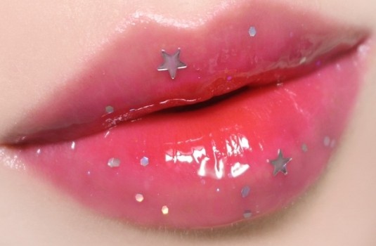 除了唇釉,「Pearly Night」系列也推出了可愛的亮片唇蜜,有粉紅、黑兩款,有著大大的星星(黑)、愛心亮片(粉),疊擦在原本的唇彩上妝感很可愛,很適合參加PARTY~(但是要記得不要將亮片吃下肚呀)