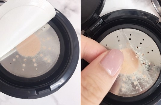有37個孔(36小孔+1大孔),能阻絕水分流失兼顧衛生。輕壓可以看到墊片內的氣墊吸附滿滿的粉底。