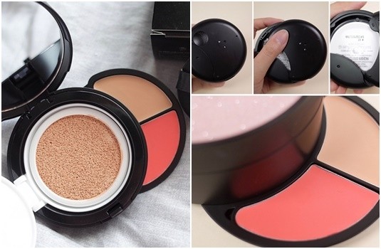 而下層則有高遮瑕力遮瑕膏及高顯色腮紅,向外推開來就可以使用,遮瑕及腮紅霜質地都非常潤澤服貼,用指腹就能輕鬆上妝,這盤根本補妝神器!因為有分上下層,當然氣墊外觀也會變得厚一些~讓氣墊偷偷增高了呢!