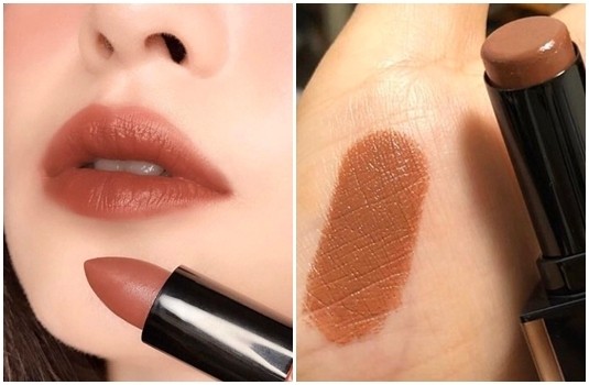 質地非常柔滑,且添加日本製造高品質色料,並注入日本山茶花油,打造飽和光滑的唇色,充滿難以言喻的高級感!塗抹在手上試色,顏色感覺是較深一點的棕色,但實際塗擦在雙唇上,是能與雙唇與肌膚色調融合的潤澤棕~