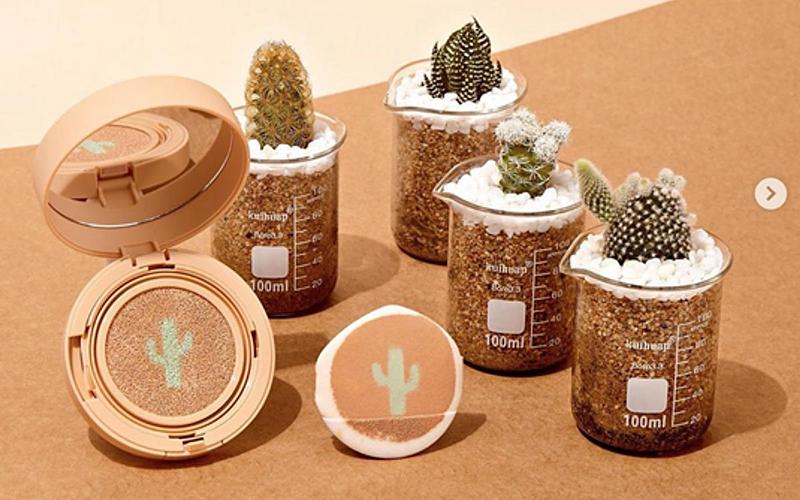 近年熱帶風格的元素相當火紅,像是火鶴、仙人掌、龜背芋等風格,經常用在包裝設計或是居家擺飾上面,不僅如此,最近甚至被應用到彩妝中,韓國彩妝品牌就推出一款「仙人掌氣墊粉餅」,不是包裝印了仙人掌,而是直接做在氣墊的海綿裡面,整個可愛到破表!