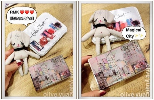 「RMK藝術家玩色組」彩粧盒沿用以往耶誕限定的抽屜式設計,而且這次的彩妝顏色參考了「Magical City」插畫中所使用的顏色,像是紅、藍、黃、咖啡等,然後照慣例功能最齊全、最實用,連迷你粉餅粉撲都有,全部變成迷你版好可愛。