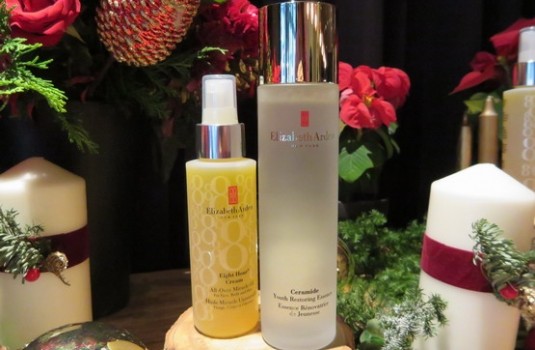 旁邊的長桌也有漂亮的耶誕節裝飾品,隨便拍都好漂亮!「八小時輕感平衡油」及「時空彈力保濕賦活露」藏在其中,還有金色的Untold Absolu香水!