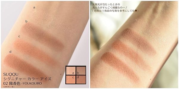 為了呈現高雅清透的大人系雙眸,講究洗練的色彩和追求透明感,大量添加清澈珠光-clear pearl,即使深色調也具有清透般的輕盈。此外,更採用高反射珠光,實現生動鮮活的光澤感。即使疊擦4色,色澤的層次均勻不濁色,緊密服貼於肌膚的薄膜質感。而這次推薦的#02陽香色,是人人都能輕易嘗試且駕馭的裸棕色調,高質感的顯色效果,隨意塗擦都神美啊!