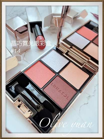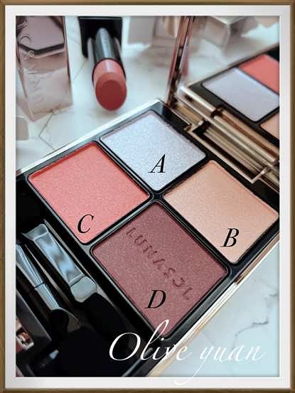 「晶巧霓光眼彩盒(NT2,250)」14號色主要還是以磚橘紅色眼妝為主,但上面兩個顏色能讓暖色調眼妝特別不同,先以左下橘紅色大膽打底,再用右下角增加深邃度,接著就特別囉!用右上角膚色來揉合C、D,接著用左上角天藍色於眼頭及上眼皮中間,增加立體光澤感!