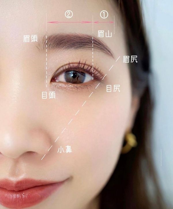 首先先來複習基本的漂亮眉型比例,眉頭要對齊眼頭、眉峰在眼尾後段的1/5處,眉尾則落在鼻翼延長經眼尾的延長線上,記得這個黃金比例後,就可以開始來畫眉毛囉!