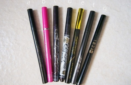 這次實測的產品就是這七支!許多在開架眼線界榜上有名的單品,像是maybelline超激細抗暈眼線液小金蓋、以及戀愛魔鏡的按壓眼線、與其他女孩們耳熟能詳的品牌,從a-g七支同時實行防水、抗暈染、卸除度測試,這幾支也都是編輯部愛用款喔!
