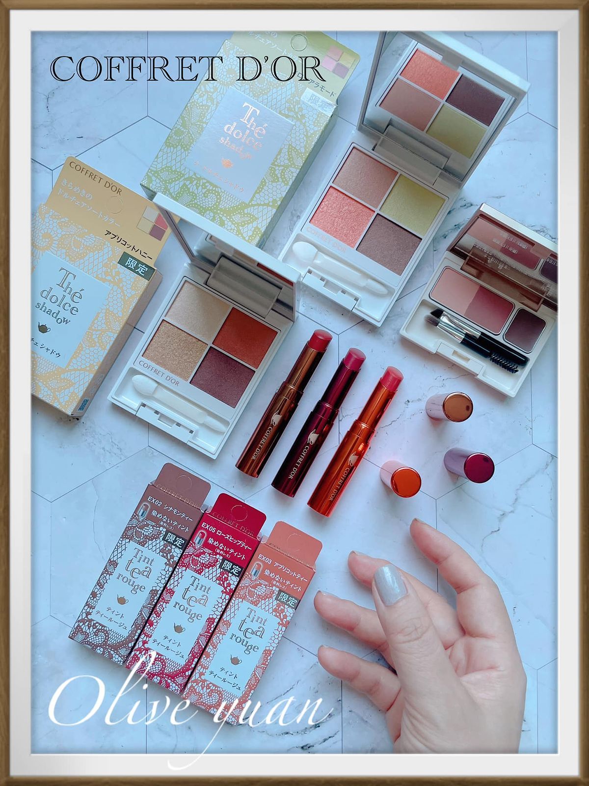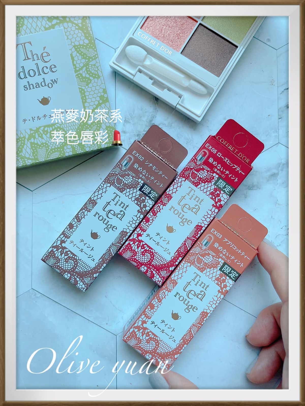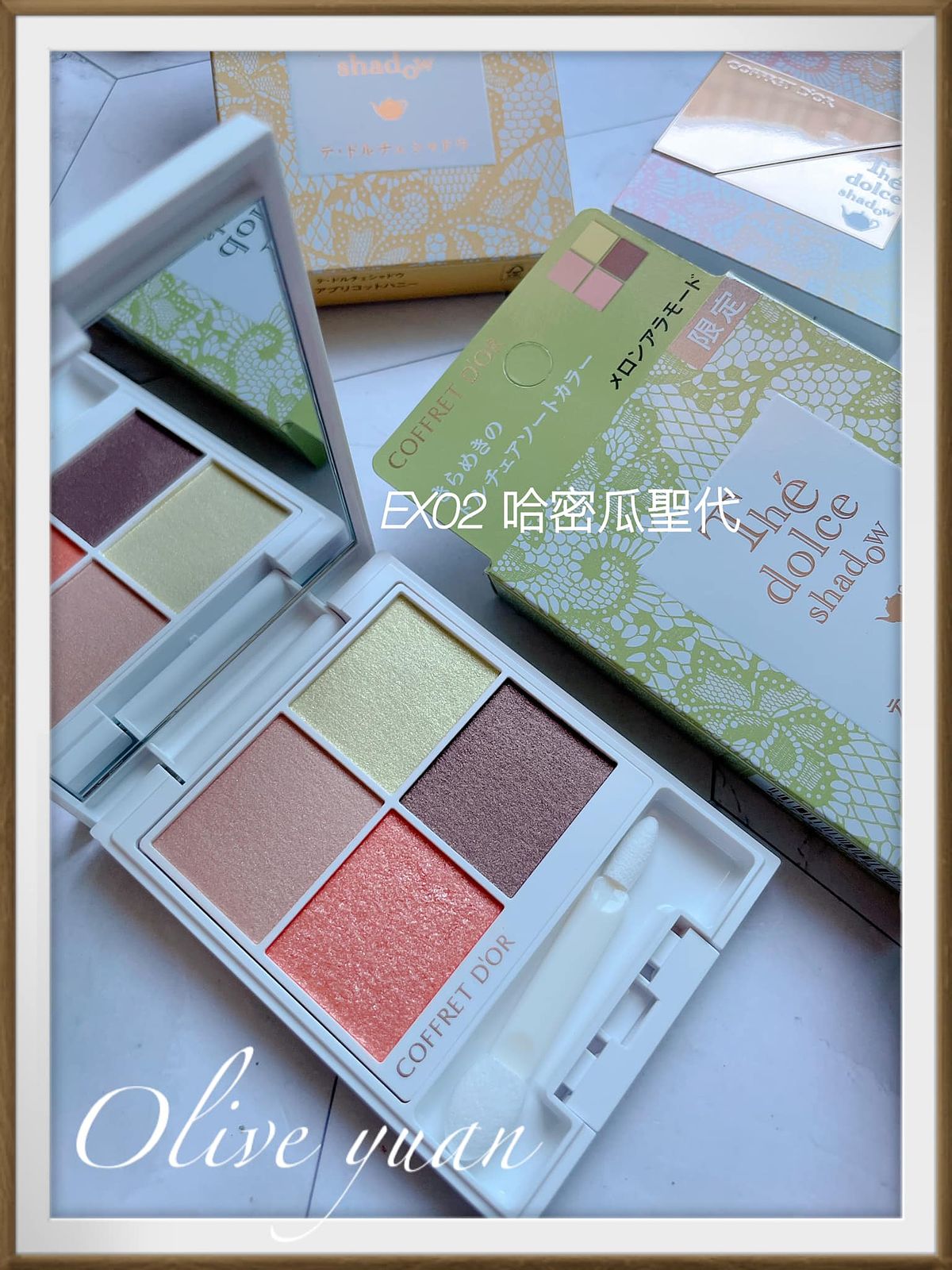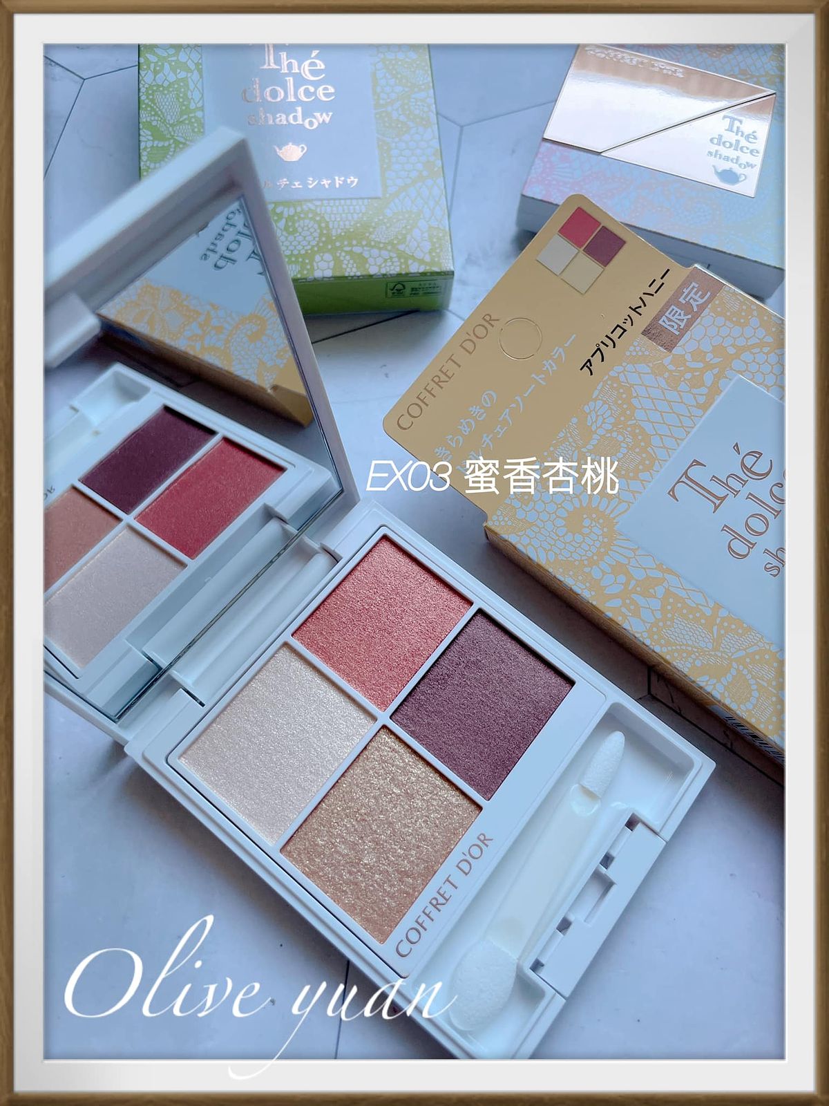 很喜歡「COFFRET D‘OR」現在都不按牌理出牌的態度,每次都讓人意想不到,而且每次都很令人驚艷,例如大家都推出秋妝的九月,才突然推出夏妝,主題爲「Summer tea party collation」,但無所謂,眼影盤外盒設計漂亮到不行,顏色組合因為以甜點為靈感,所以也不常見,就算已經快要換季也很值得入手,例如眼影盤的EX03蜜香杏桃就很適合冬天。