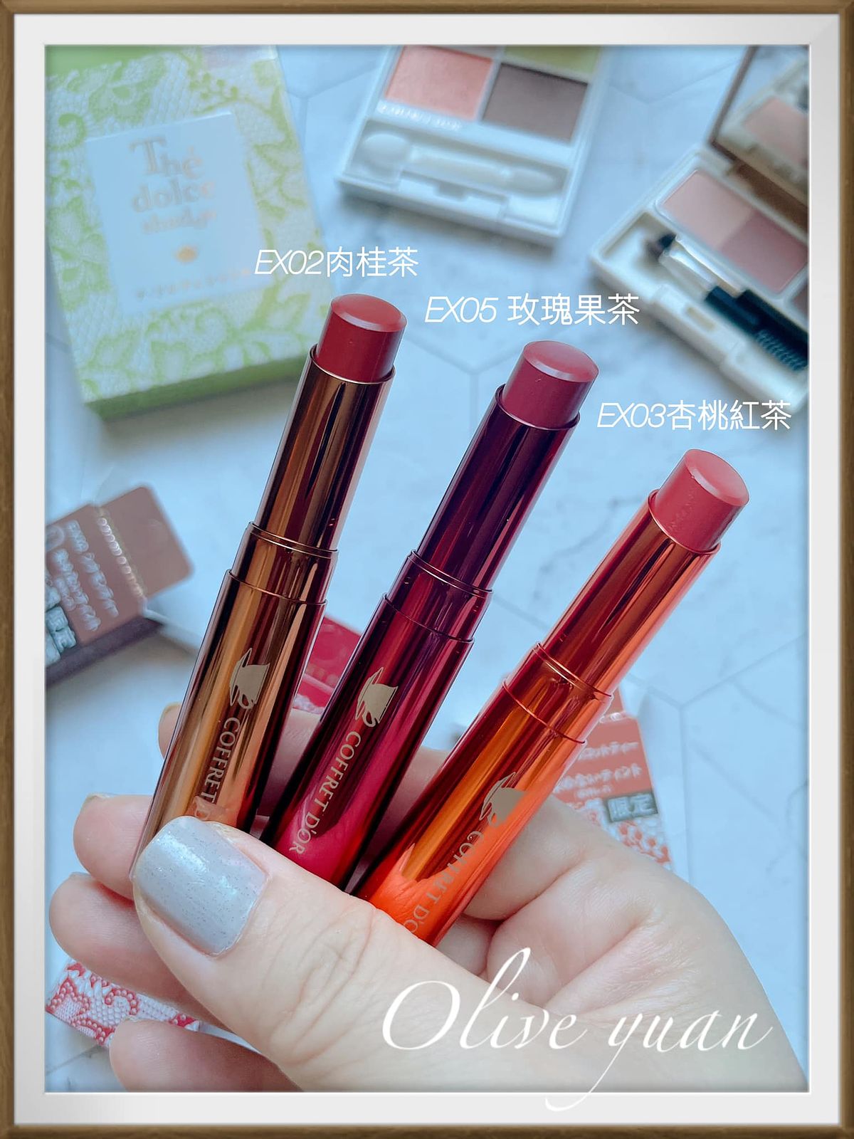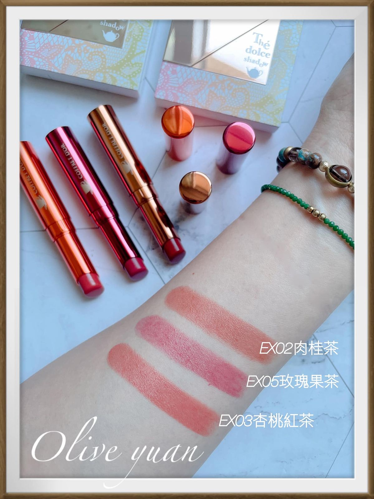 四個顏色的質地也不太一樣,但成分中有保濕玻尿酸,所以都很服貼,EX03蜜香杏桃顏色超級美,尤其是杏桃色與金色粉質特別細緻,所以輕抹就非常顯色,模特兒形象圖感覺比較柔和,但大膽上色應該會很搶眼。