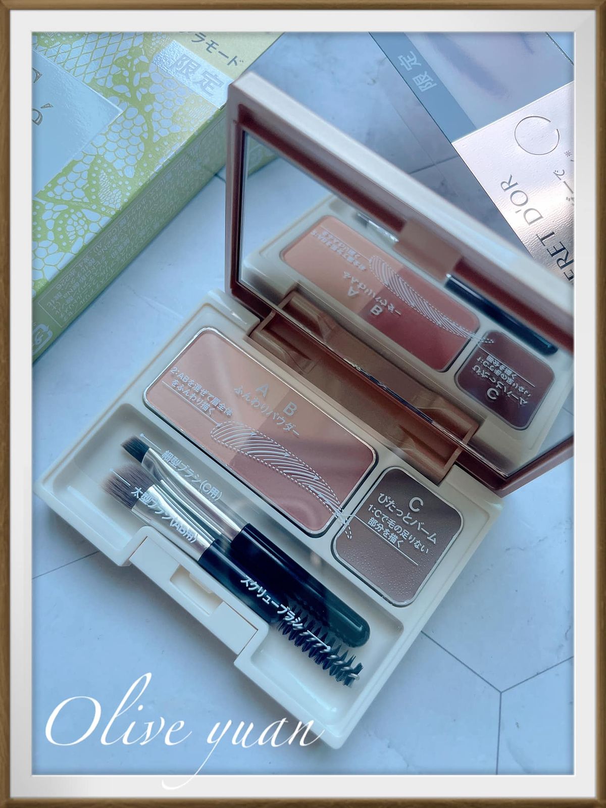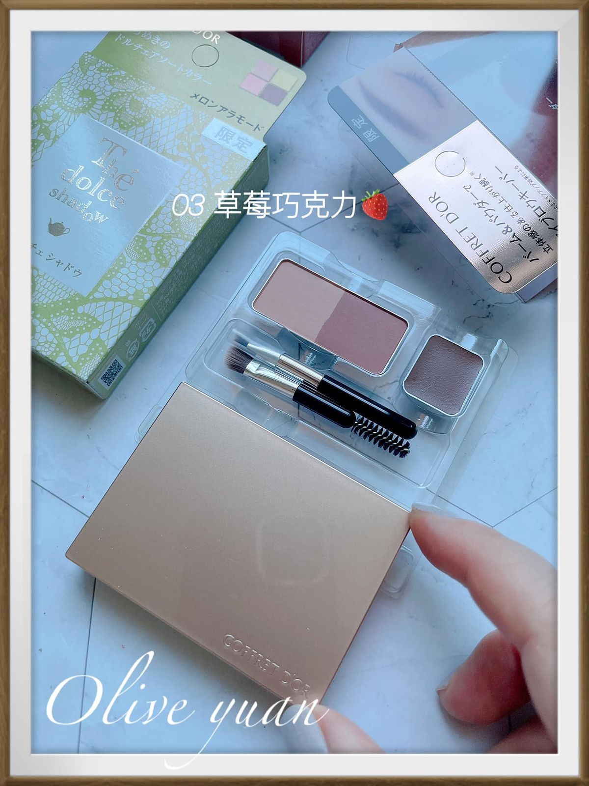 最後是這次的主打商品,「持色有型眼眉彩限定組(NT870)」總共推出三款顏色,色號都是以巧克力為主很可愛,我入手的是03草莓巧克力,屬於灰濛粉(粉紅系),裡面除了有2色眉粉,還有1色服貼眉膏,而且工具中的小斜面刷可以畫出細緻線條。
