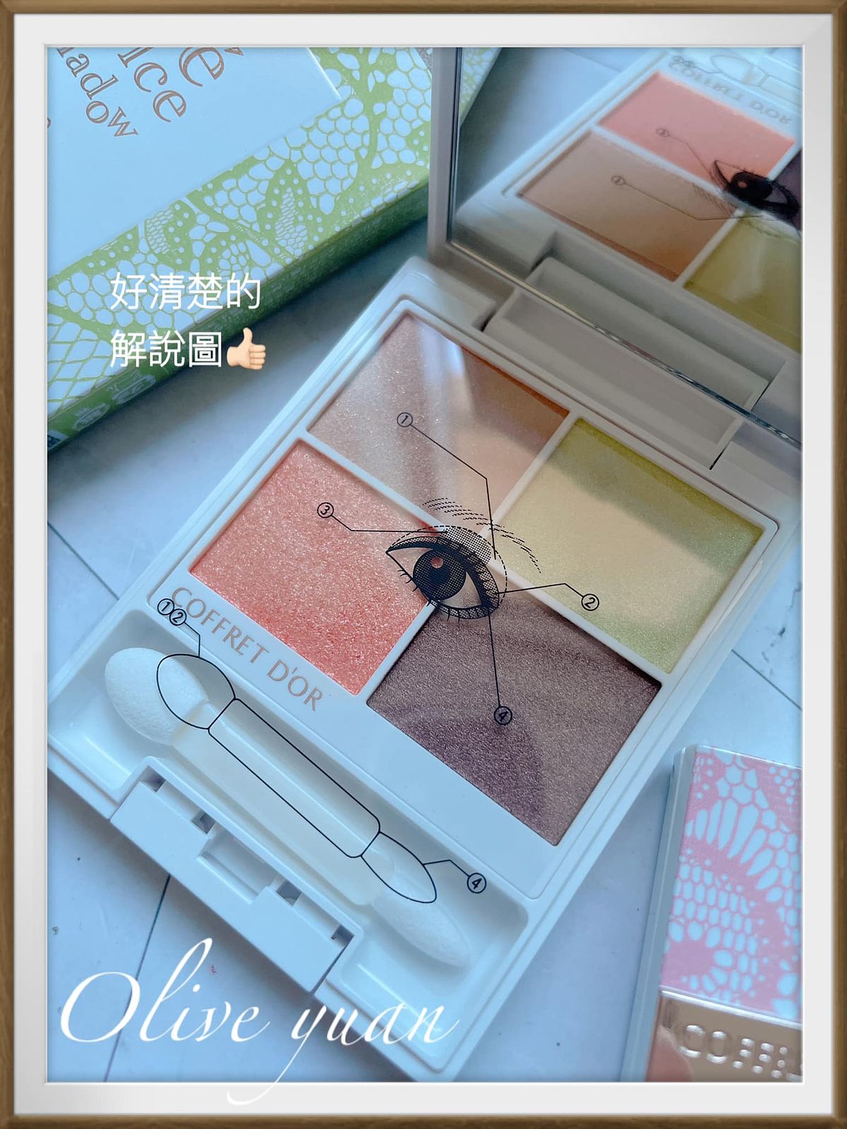 先來聊「燕麥奶茶系漾采眼影(NT1,050)」,外盒不用多說,應該已經擄獲非常多少女心,而且不同色系外盒顏色也不同,蕾絲底紋加上小茶壺的圖案,真的很值得全收藏,打開還可以看到清楚的教學圖。