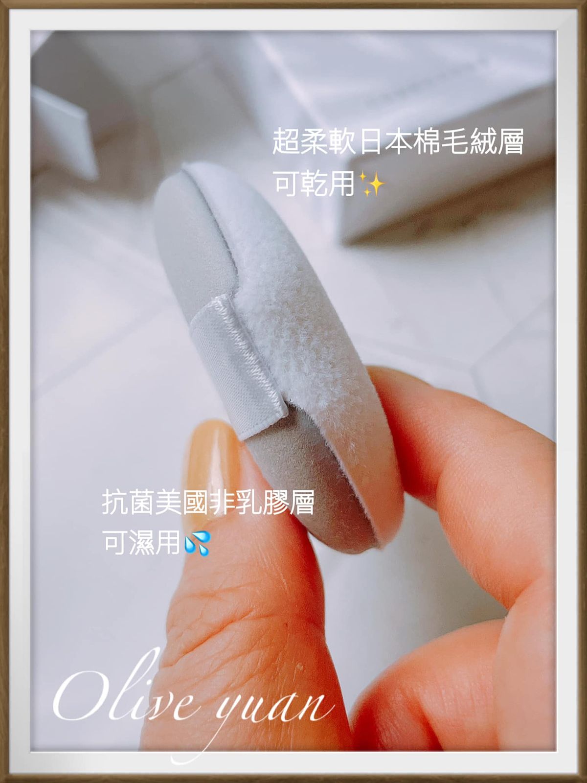 它摸起來的質感就跟肌膚一樣,特殊發泡技術不易脫屑屑又耐用,適合搭配水性、乾性粉底液及霜,包裝袋材質很厚所以別扔,可以當收納袋使用。而且除了乾濕兩用,還可用面紙包起來當吸油海綿使用,很方便!