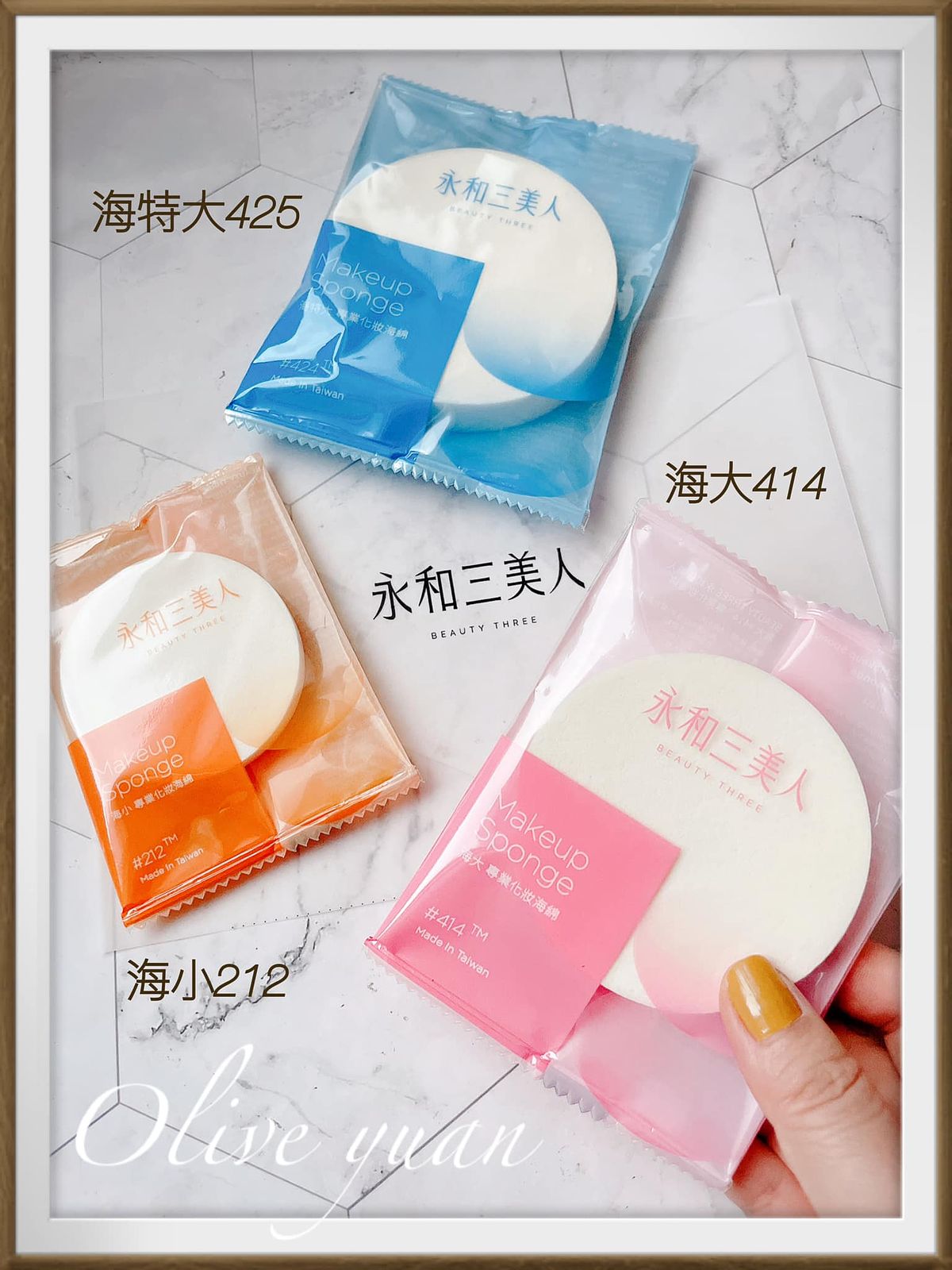 而且與其說用指腹上妝最方便,但「永和三美人」的海綿質感就是比較柔軟呀!推抹在肌膚上的感覺比指腹更溫柔,更能減少磨擦及拉扯,而最多人愛用的應該是「經典NR天然乳膠粉撲」,有海特大424(NT31),海大414(NT25)及海小212(NT20),代言人寇瑞最愛用海大414,我個人喜歡海小212。
