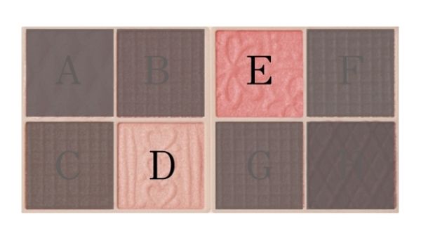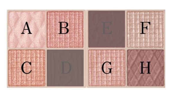 這款8色眼影當中擁有兩種不一樣的眼影質地,上圖字母ABCFGH區塊,是可創造光澤潤感眼妝效果的質地,字母區塊DE則是能創造立體感的粉霧質地,兩種不同質地的搭配,可輕易交疊暈染出完美的妝效!