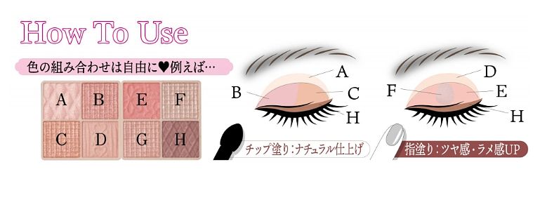 接下來來推薦大家兩種眼影畫法,分別是運用眼影棒及指腹,畫出不同的妝效的眼妝!第一種畫法是選擇眼影棒上妝,可畫出自然的妝效,先沾取眼影盤A從上眼瞼睫毛根部暈染至整個眼窩,再沾取B眼影暈染至雙眼皮眼褶,接著使用C暈染在上眼皮眼尾後1/3處,最後以D描繪在睫毛根部即完成。第二種畫法以指腹上妝,這樣的畫法可以加強眼影的閃耀光澤感~建議畫法是先以指腹沾取眼影盤D從上眼瞼睫毛根部暈染至整個眼窩,再沾取E眼影暈染至雙眼皮眼褶,接著沾取F點於上眼正中央,最後以H描繪在睫毛根部即完成。