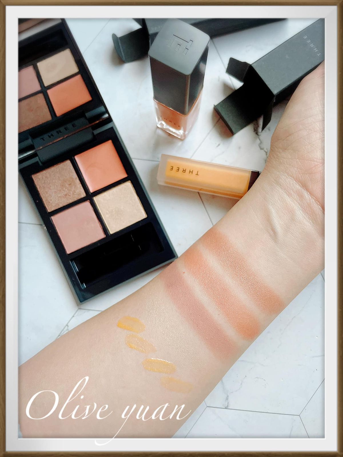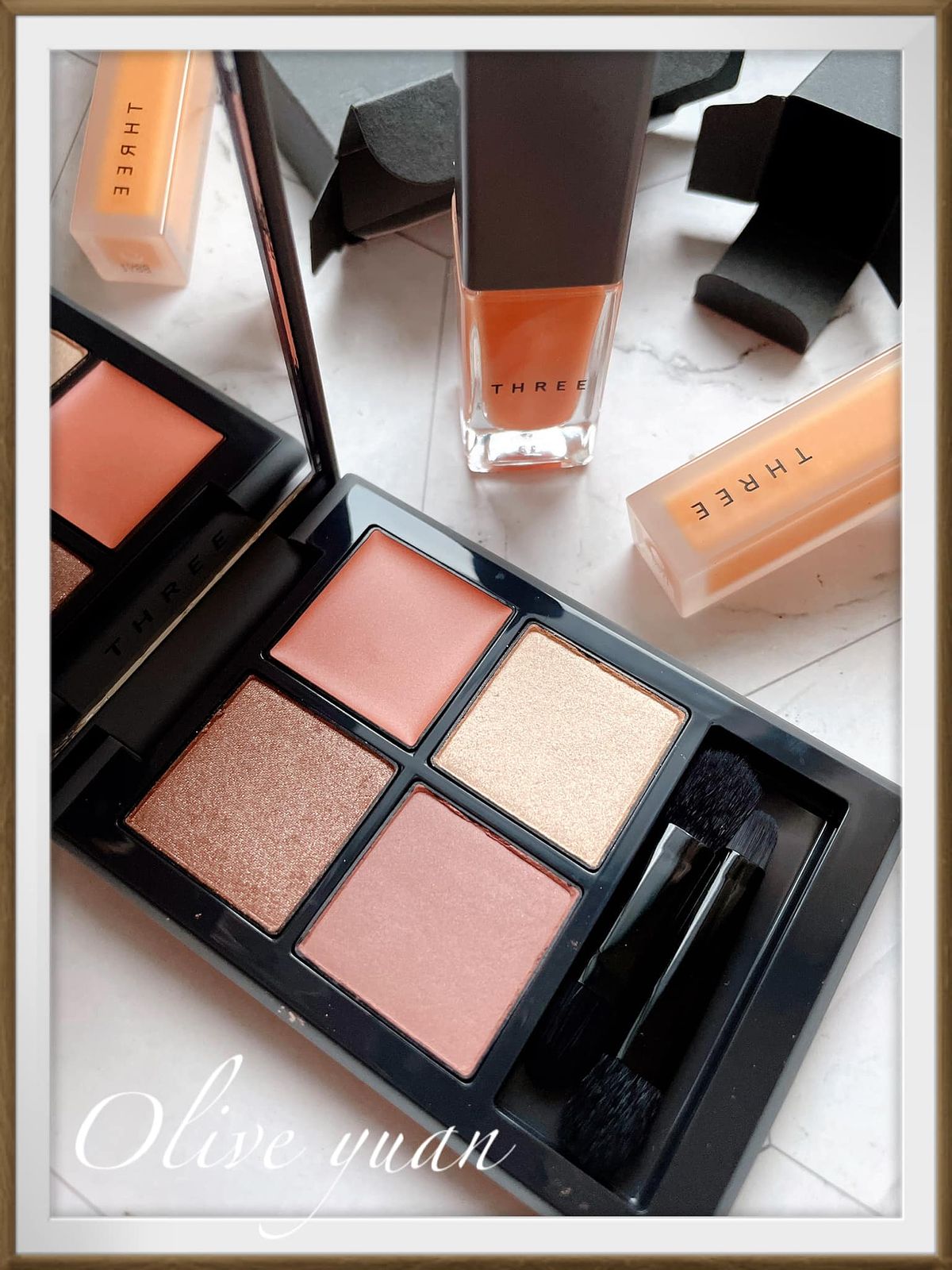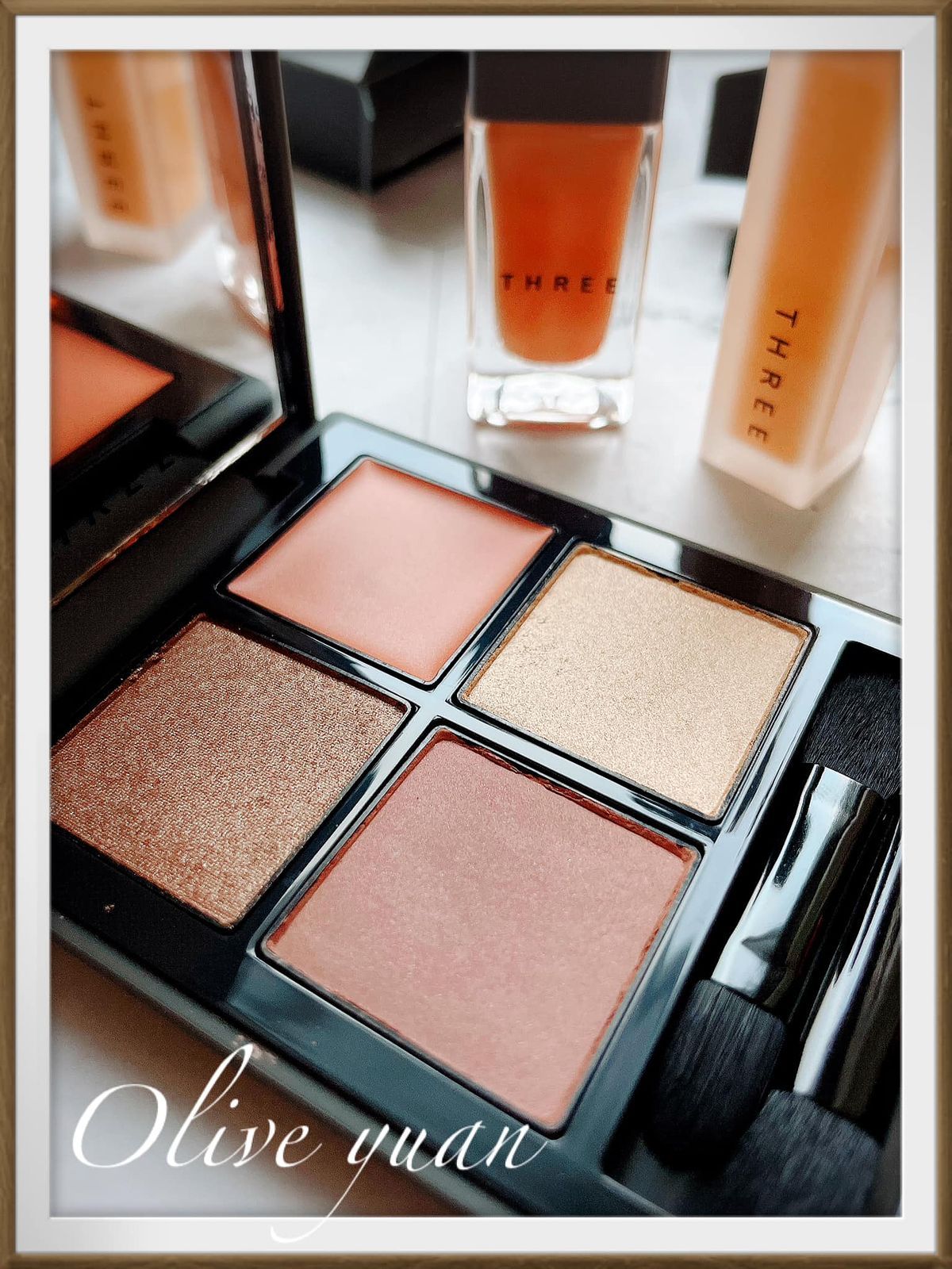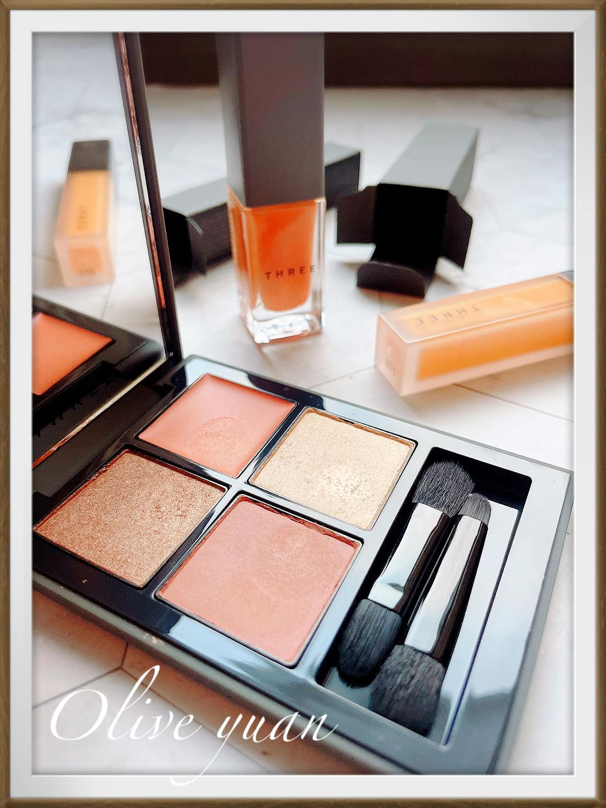 「魅光幻眸眼采盒(NT2,400)」推出2色,一款偏橘一款偏粉紅,我入手的13是偏橘色的Model使用色,屬於“散發的冷調光燦中,堅毅力量與溫柔並存的唯美裸金。右上主色為霜狀底膏,左上為耀眼珠光,右下也很耀眼但粉質極細,左下則為霧面質地。