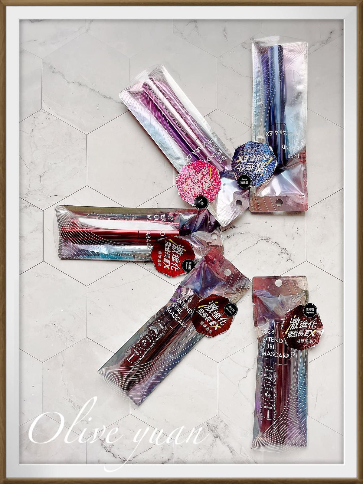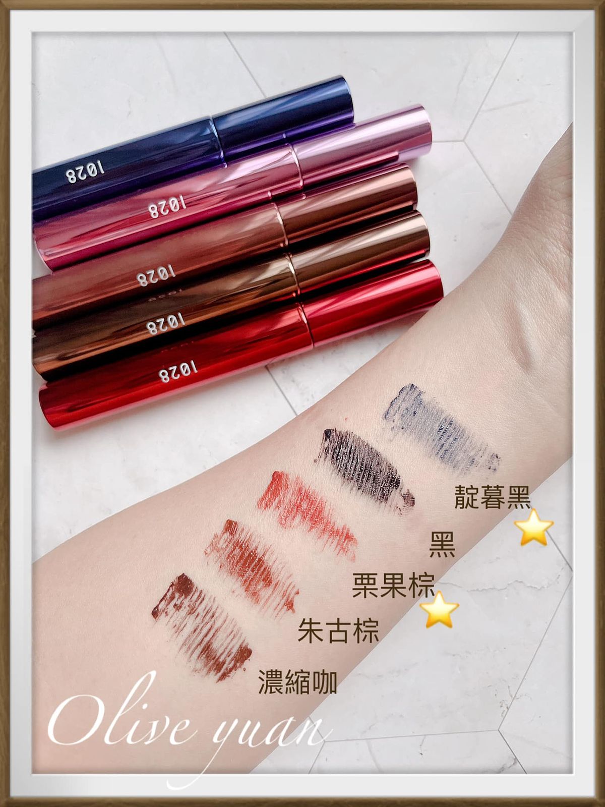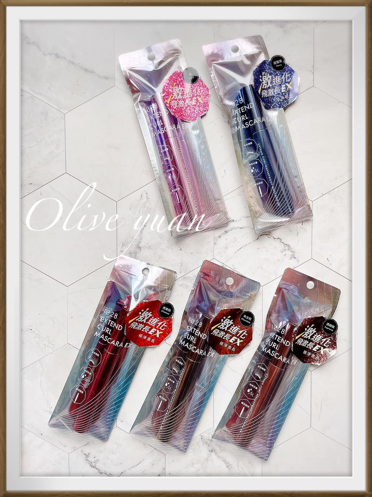 這5支不同顏色的睫毛膏擺在一起真的好美,而且1支才NT390耶!如果藥妝店有優惠活動的話,真的可以5色全掃!尤其“靛暮黑”及“栗果棕”好特別!這是1028推出的「1028飛激長瞬翹防水睫毛膏EX(8g NT390)」,2.0全新有感升級。