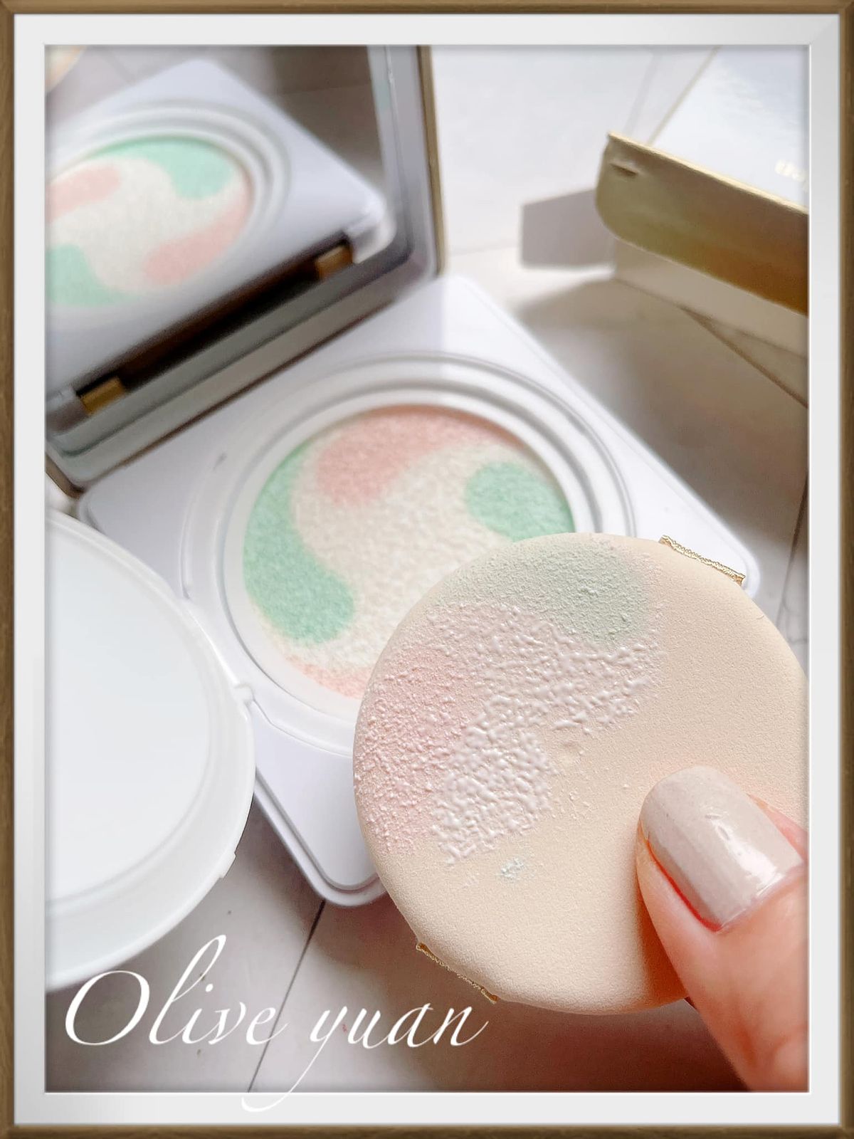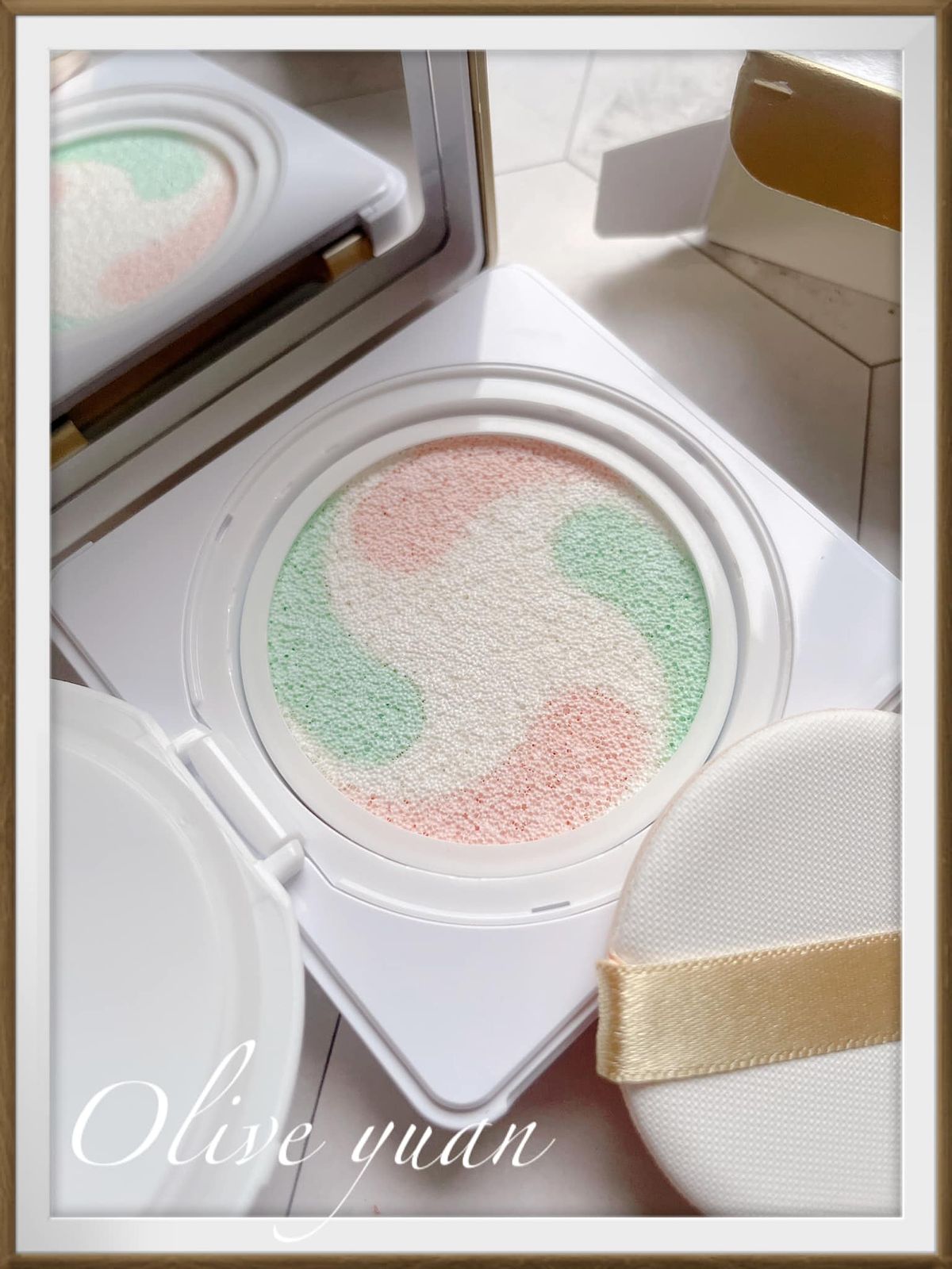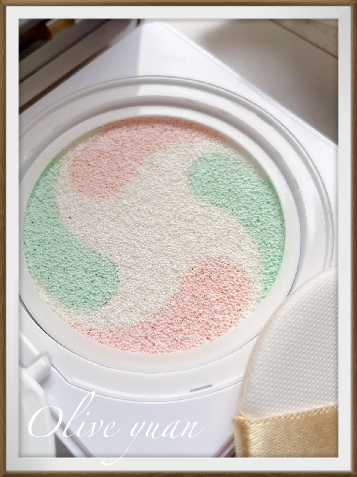 這氣墊的顏色很可愛吧!是暖色調與冷色調的組合,並以三種色調修飾膚色,綠色:能中和均勻膚色,粉色:能柔焦增添好氣色,白色:能針對肌膚黯沉加強打亮,有助於中和平衡、柔焦毛孔、提亮肌膚,令肌膚清爽、水潤、透亮,我今天用過後,不同光源下的效果也不同,但都很自然。