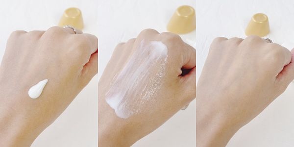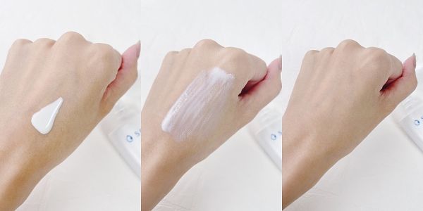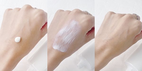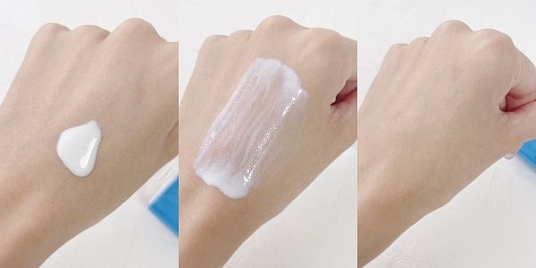 質地分析>>屬於乳白色水感質地,很快就能塗抹均勻不泛白,幾乎是秒推就均勻,親膚感非常優秀的一款。