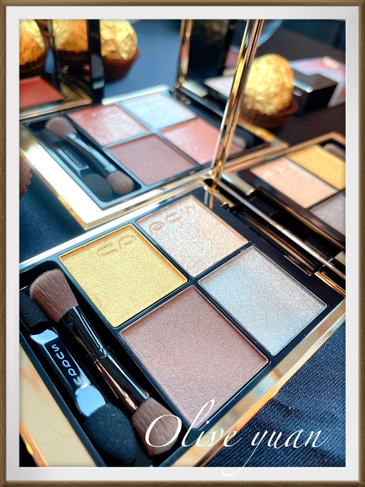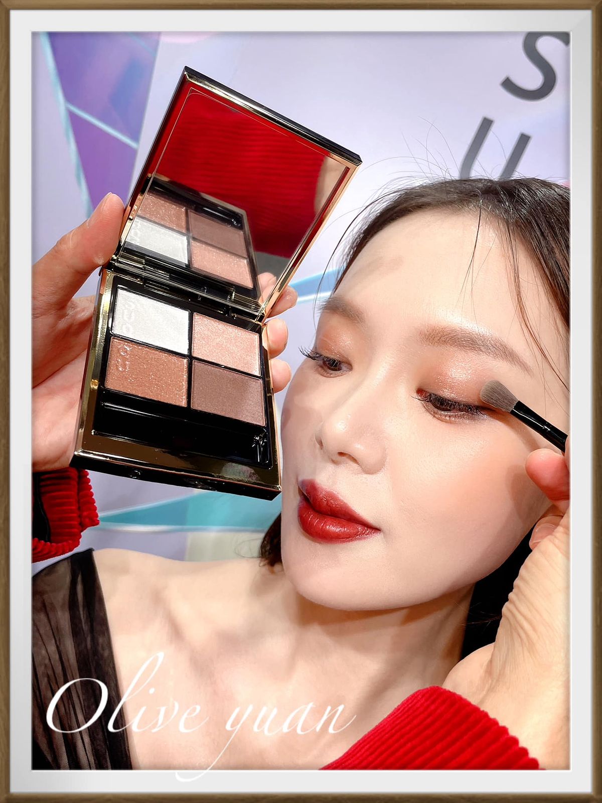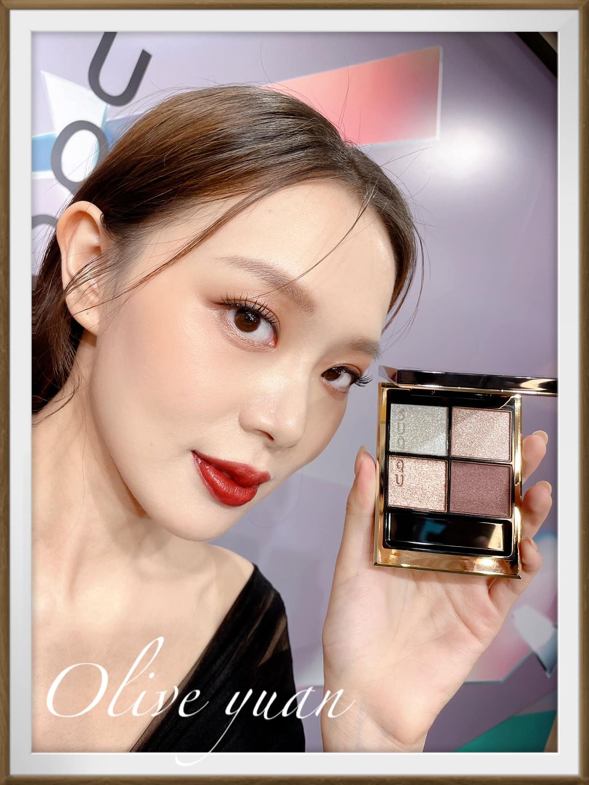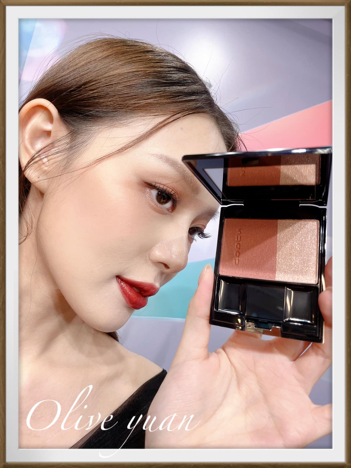 添加紅色、金色珠光的眼彩霜光芒搖曳,眼、頰、唇都能用,單擦或疊擦都OK,成分中還有保濕成分及橄欖油。史丹利老師建議用於鼻樑或是顴骨處,快速“加入仙氣”,還說這一小盒可是派對黑馬喔!