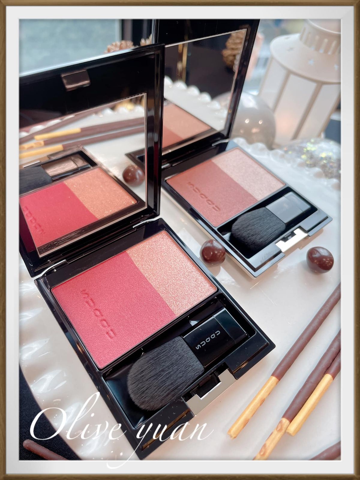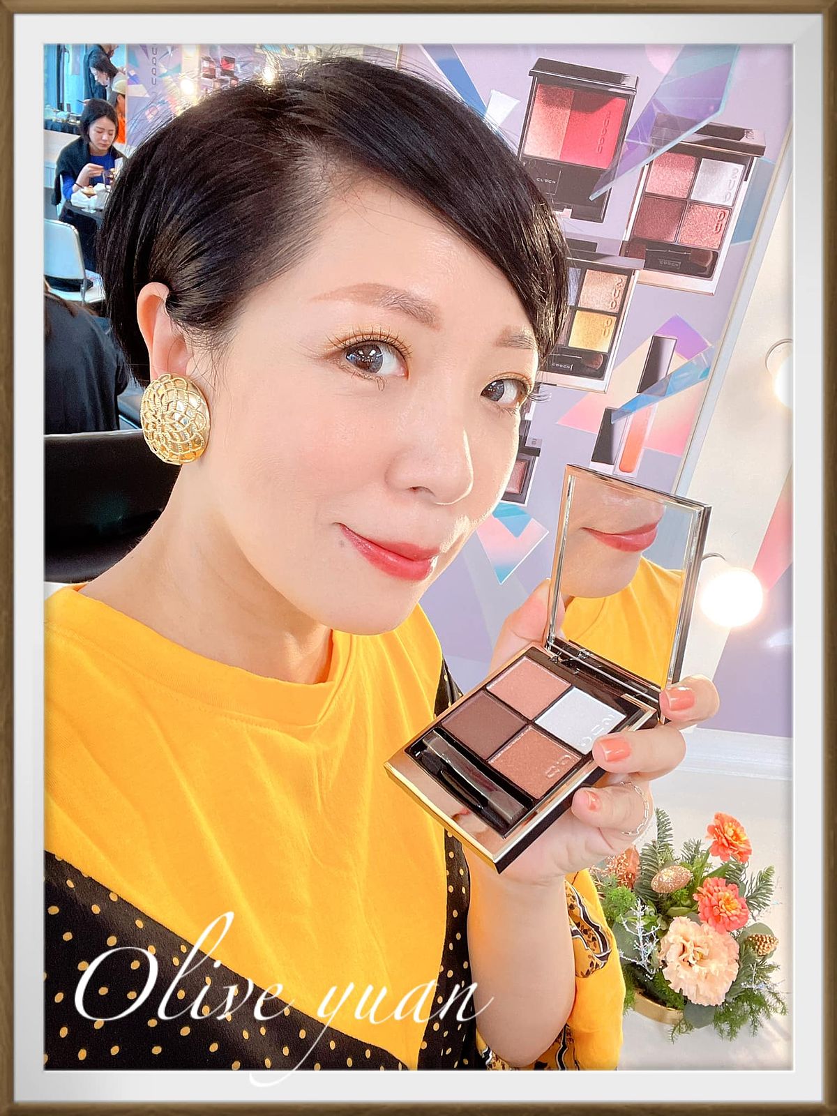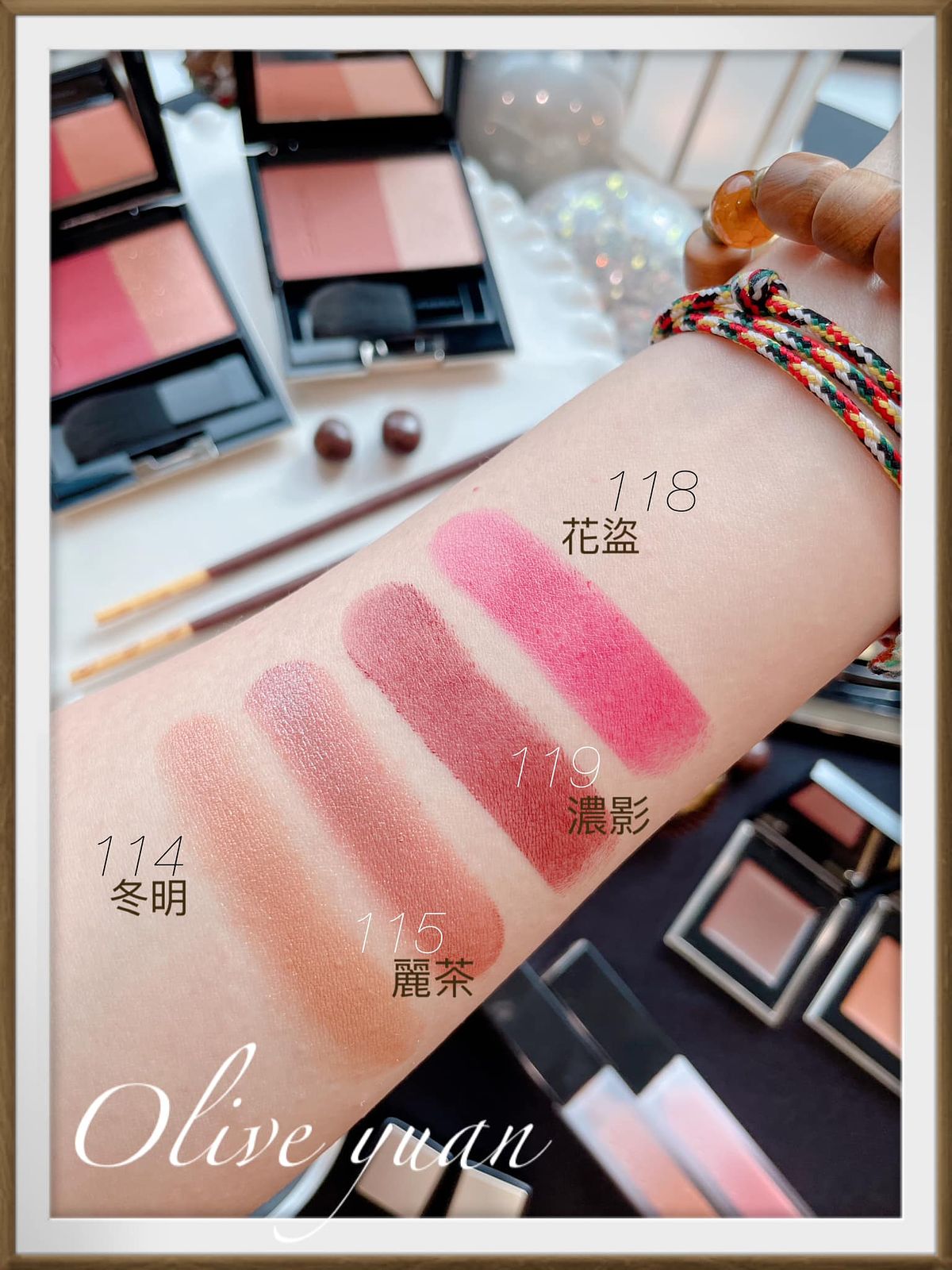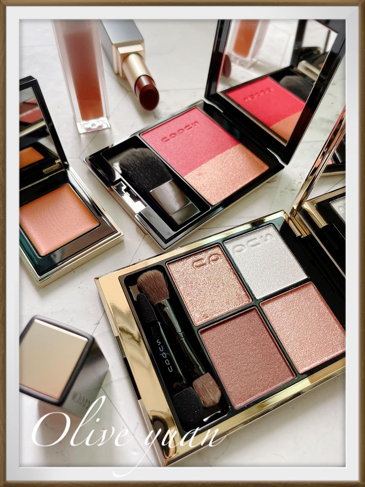 添加紅色、金色珠光的眼彩霜光芒搖曳,眼、頰、唇都能用,單擦或疊擦都OK,成分中還有保濕成分及橄欖油。史丹利老師建議用於鼻樑或是顴骨處,快速“加入仙氣”,還說這一小盒可是派對黑馬喔!