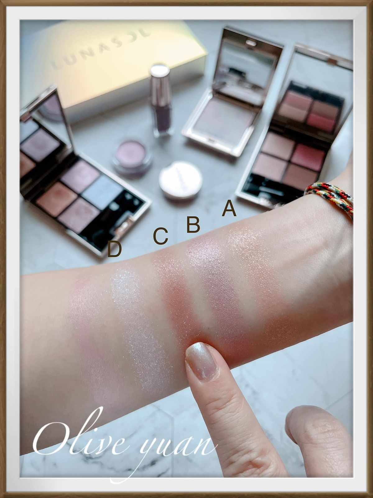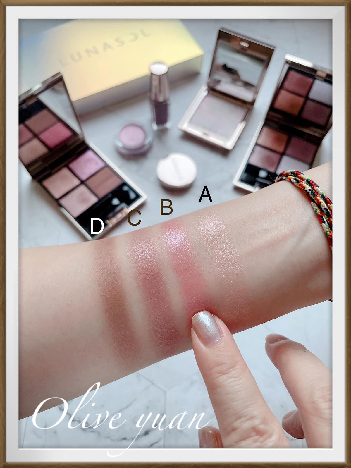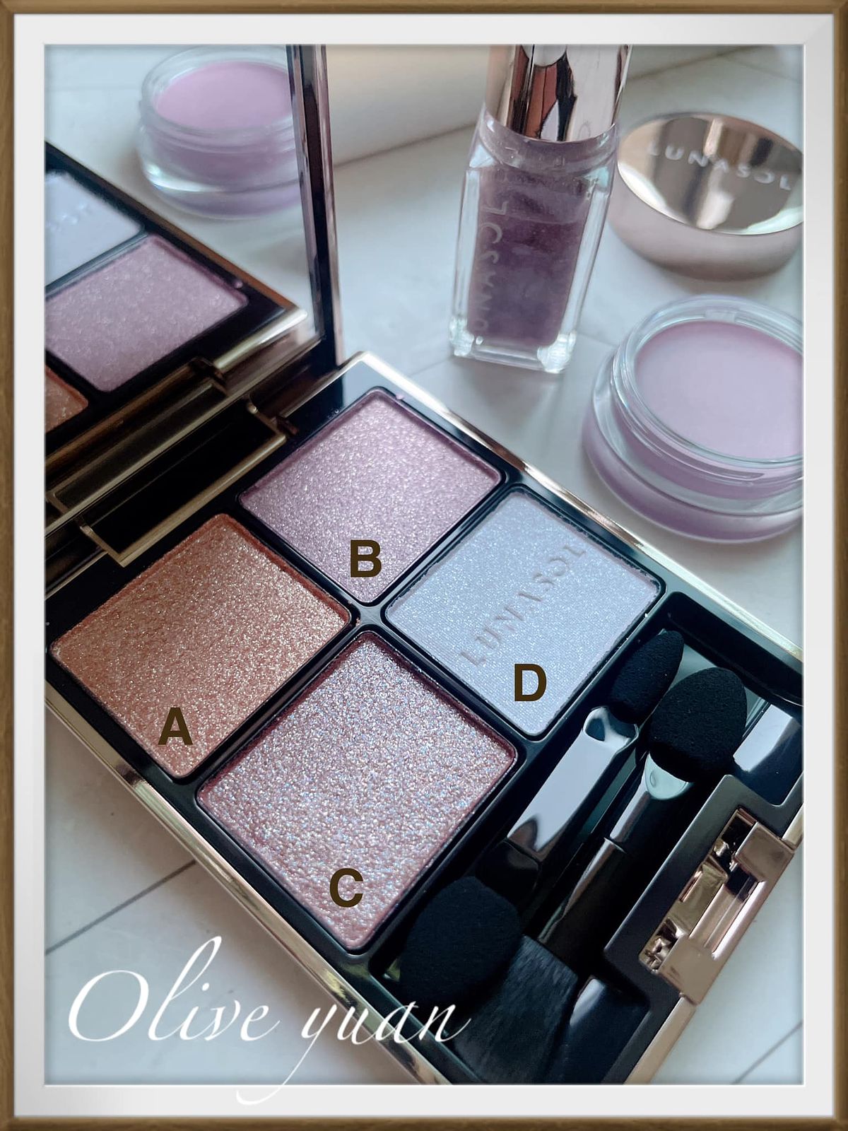(A)將金、銀耀眼光芒融合粉紅珠光的絢麗色彩。(B)閃爍偏光珠光,變換色調的夢幻光彩,紫中帶紅,變化為金色,又幻化成綠。(C)波爾多棕融入藍色、金色珠光,閃現深邃光澤。(D)藍色、紅色細緻珠光結合大顆珠光,閃閃發光,明亮閃爍。