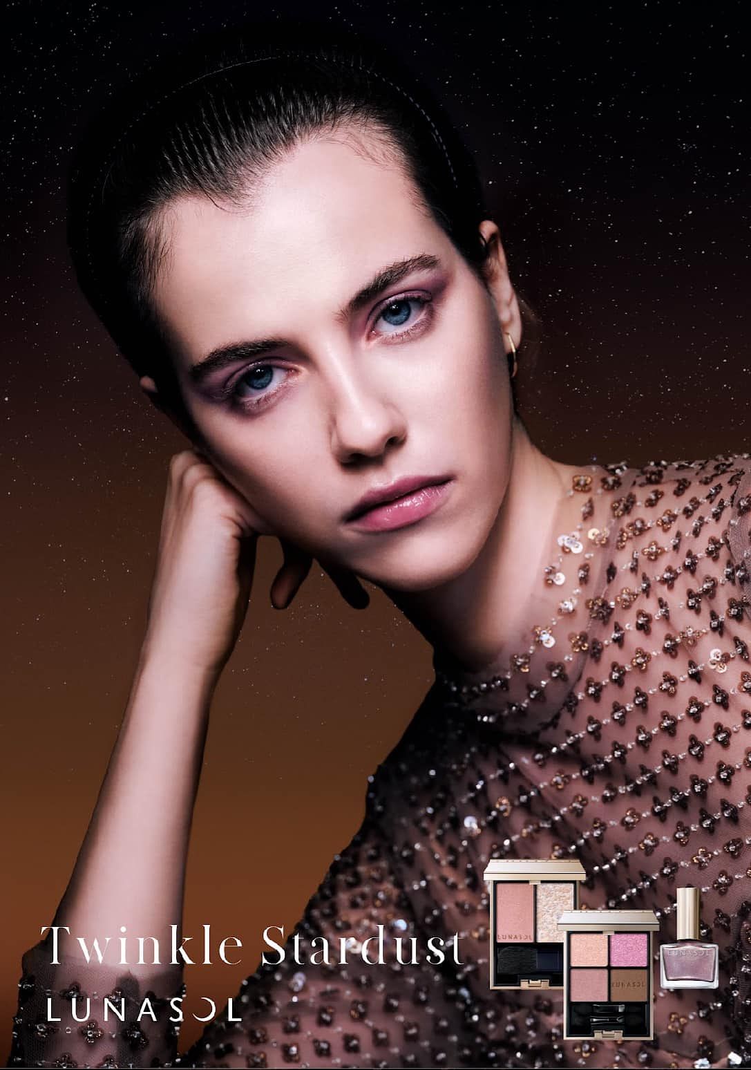 屬於如深邃的夜空星塵,閃爍優美光芒的眼影盤。先用(C)營造深邃光澤眼窩,再用(D)輕霧質地打造柔和眼摺陰影。接著用(A)帶有濕潤感的細膩光澤,點於眼皮中央及眼頭,最後用(B)華麗光彩於整個眼皮,展現存在感。