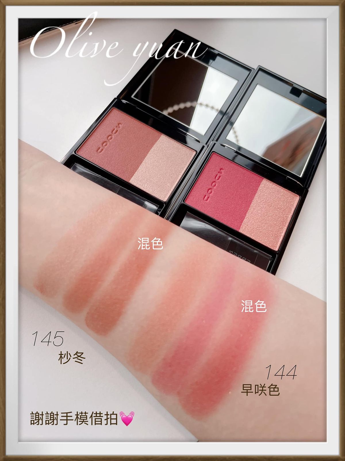 「晶采淨妍頰彩(NT2,100)」也有2盤,左邊為綢緞般的光滑顯色質感,右邊為蘊含珠光的打亮色,可單獨使用或均勻的混合,亞凡老師選擇145杪冬,是帶有紅感棕色調搭配裸金色調的組合。