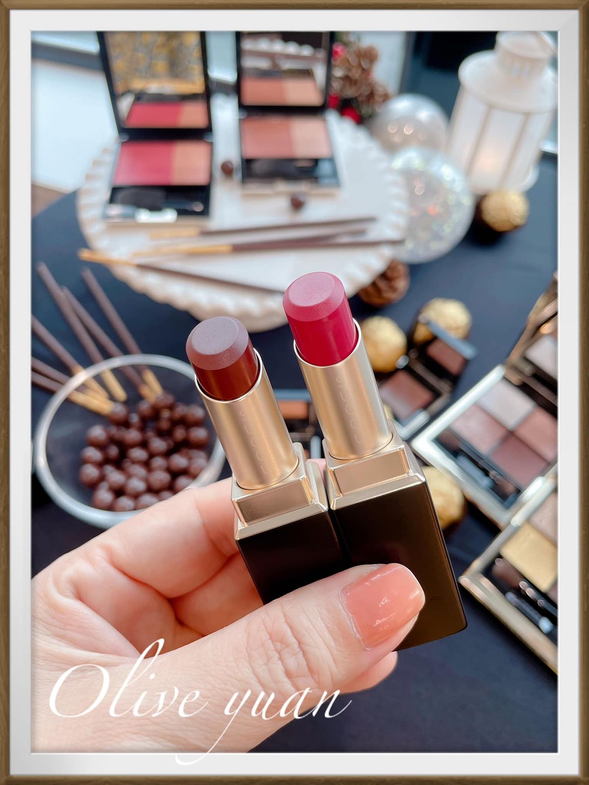 「皇室美拉德」是亞凡老師為彩妝作品設定的主題,而且是“微醺的皇室”,歡樂佳節一定要微醺呀!眼妝部分有2盤,亞凡老師選了「晶采盈緻眼彩盤(NT2,600)」129甘艷,這是粉紅色調搭配棕色調的組合,像大地色,蘊含豐富珠光及滑潤粉質,再搭配1色霧光,讓眼妝隨心所欲。