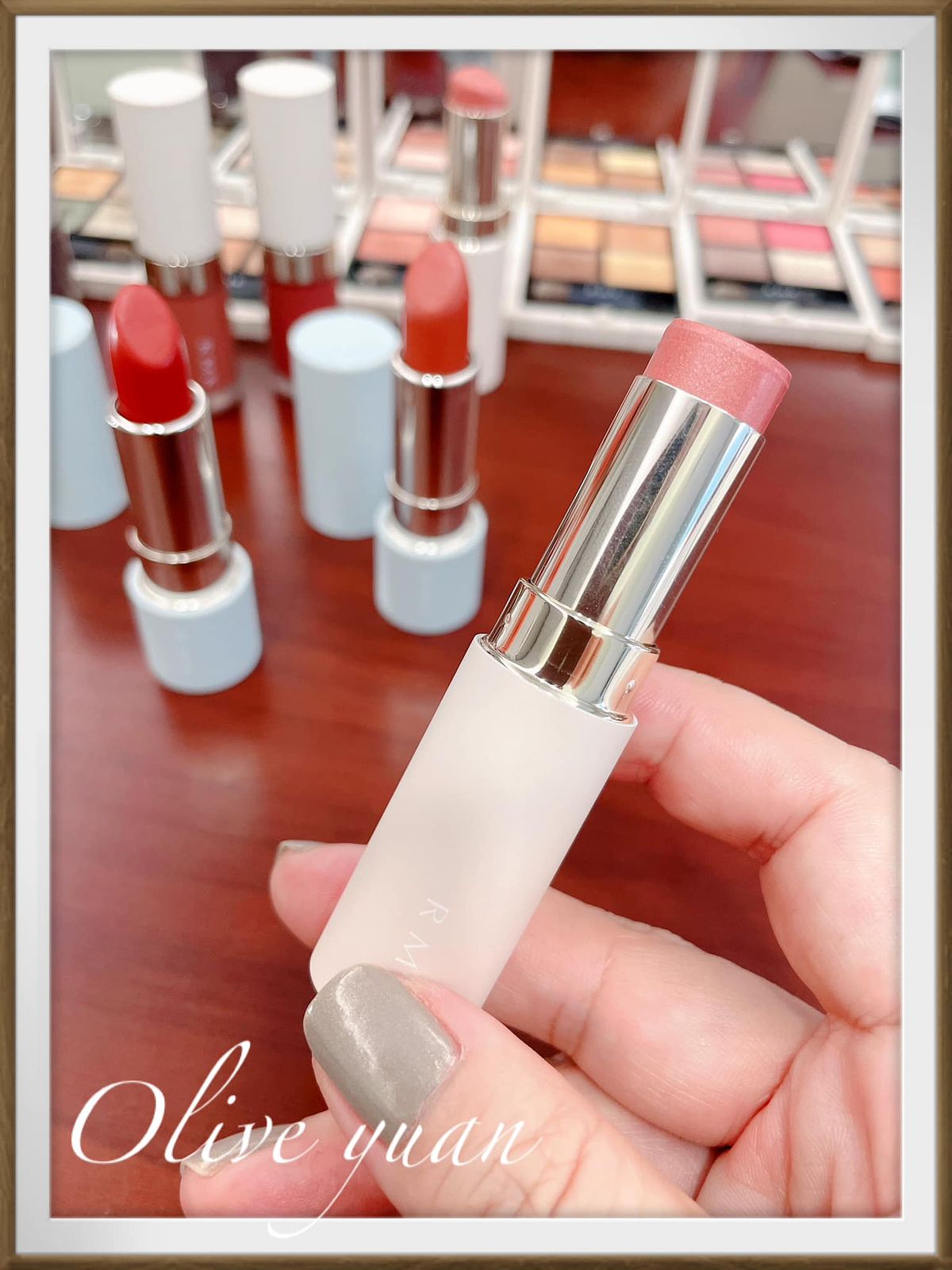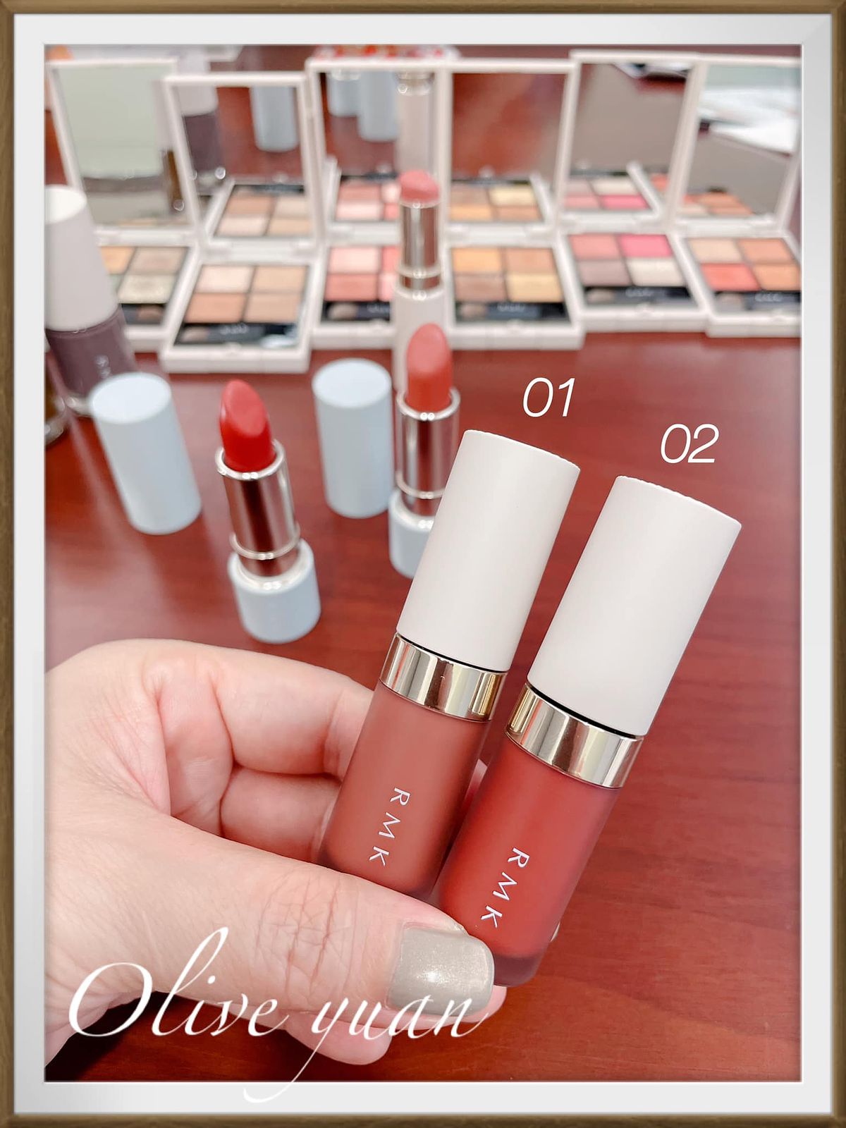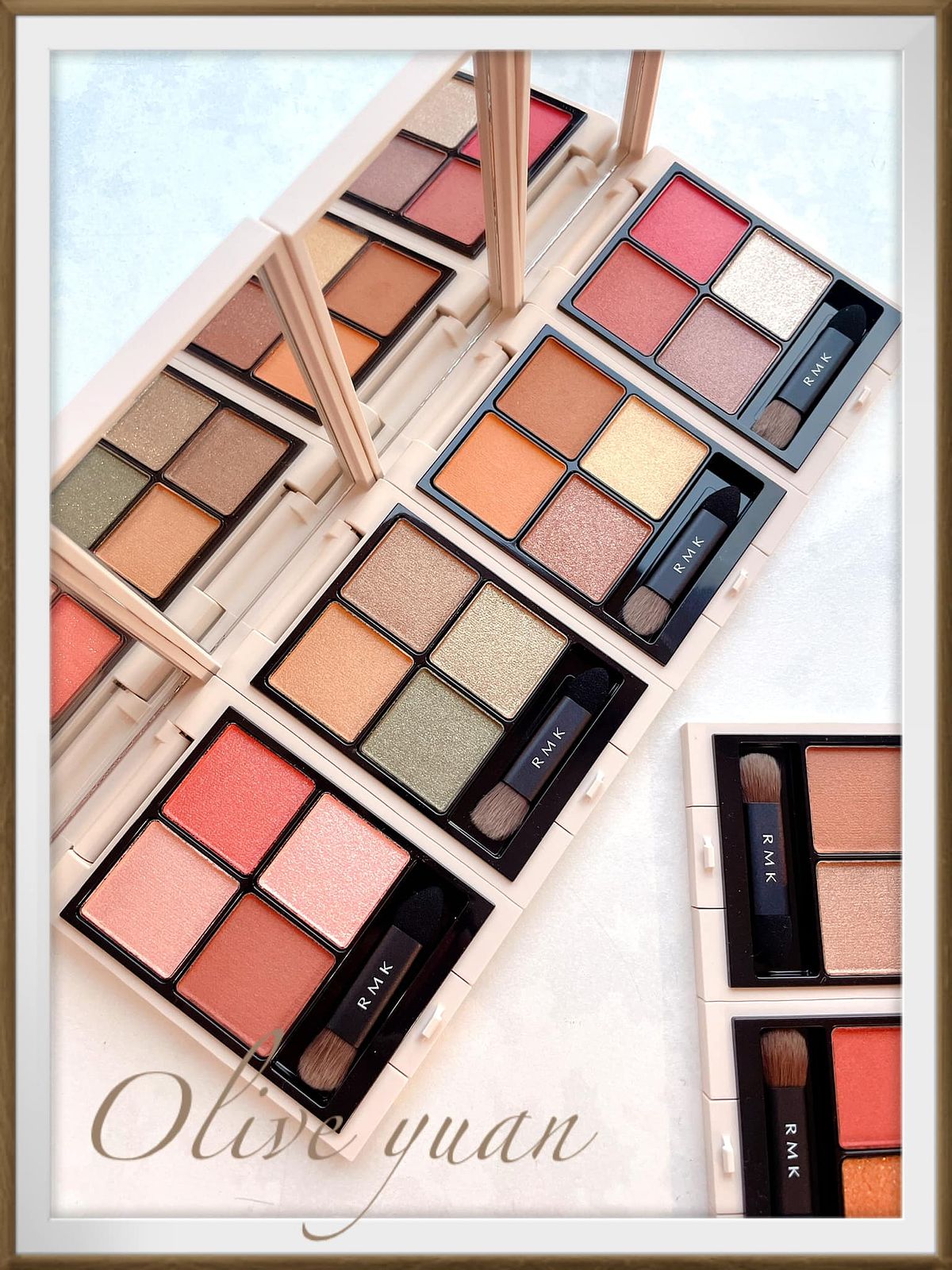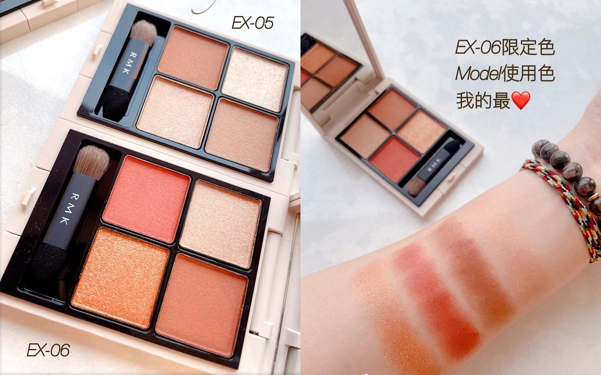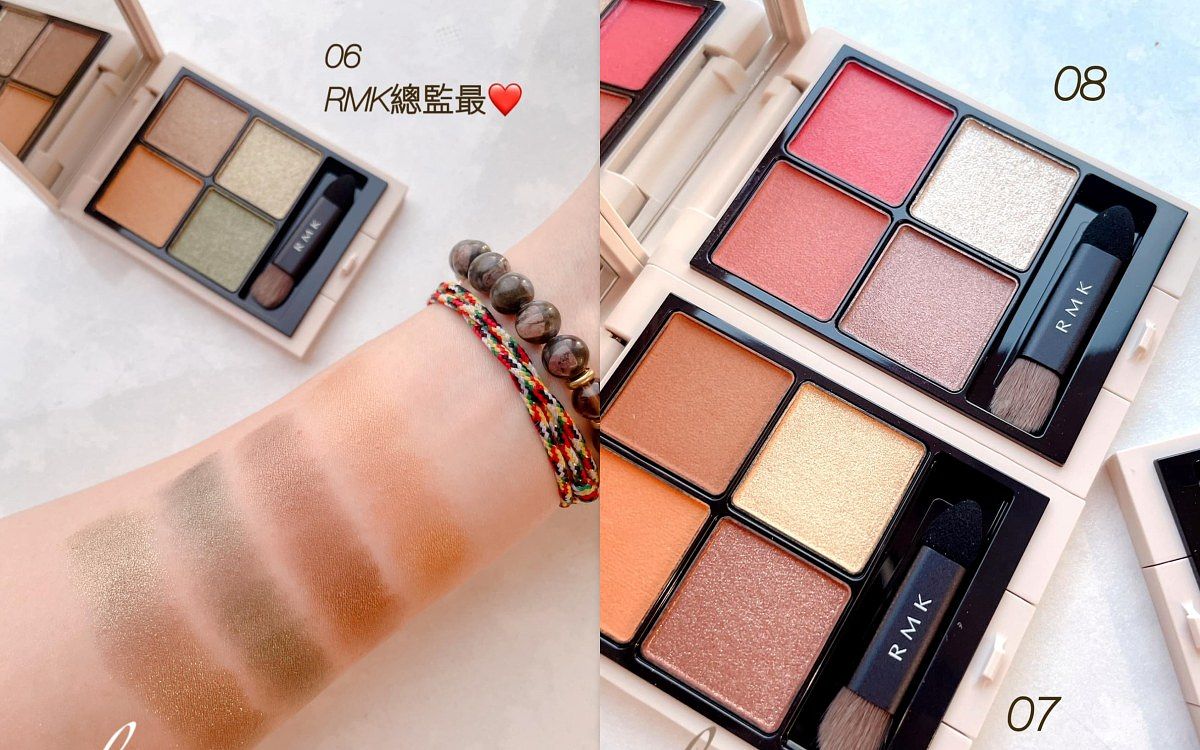 05為日本女性們最愛,散發清新可愛感的玫瑰粉色調眼影盤,雖然我比較不會用這盤,但試色後覺得很不錯,因為它的玫瑰色調帶棕,搭配玫瑰金也挺知性的,並不會太可愛。然後06是RMK總監最愛的大地綠色調眼影,屬於帥氣風格,但已經N年沒用大地色的我怕怕,但大地綠及琥珀棕眼影的鐵粉也是多得很!