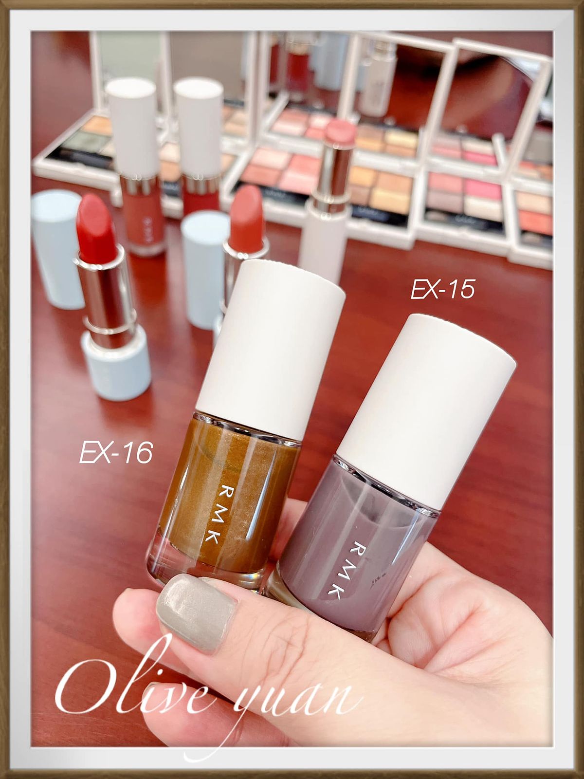 EX-15是帶紫色的春日灰色調,但我選的是EX-16帶有金色珠光的琥珀棕色調!其實指彩的顏色挺像秋冬色調的,但整體搭配起來就是很對眼。